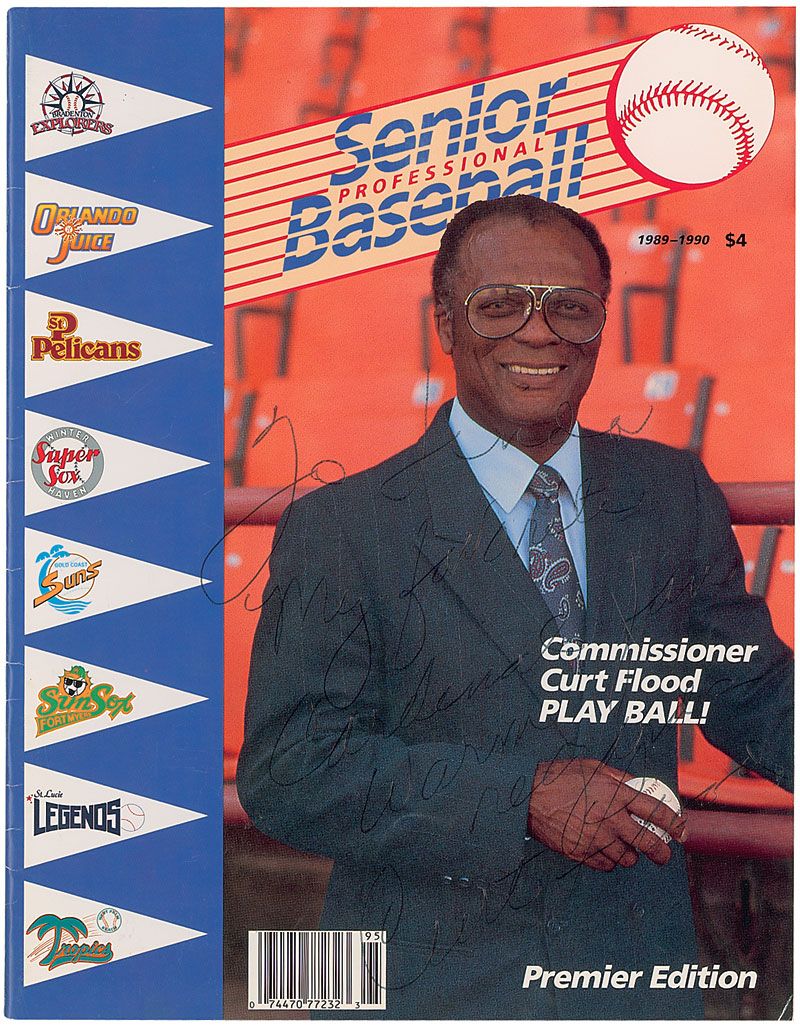 Premier edition of Senior Professional Baseball magazine, 1989–1990, 8.5 x 11, 48 pages, featuring Commissioner Curt Flood on the cover. Signed and inscribed on the front cover in black ballpoint, “To Linda, My favorite Cardinal fan, Warm regards, Curt Flood.” In very good condition, with moderate to heavy contrast to signature and inscription.