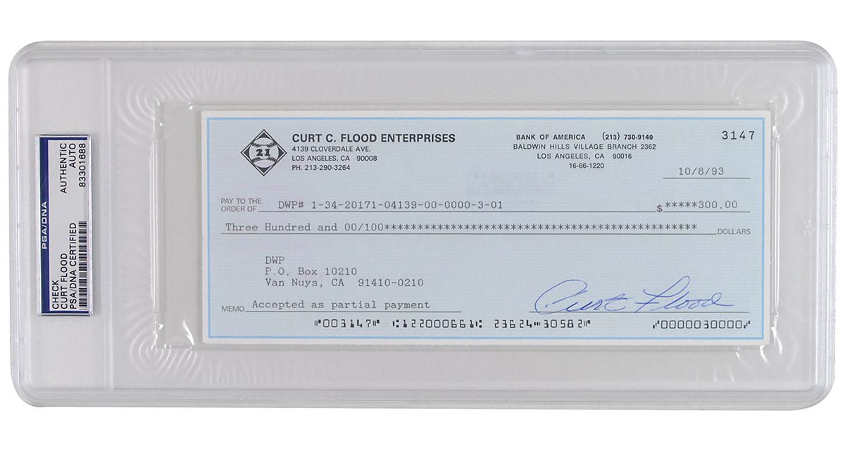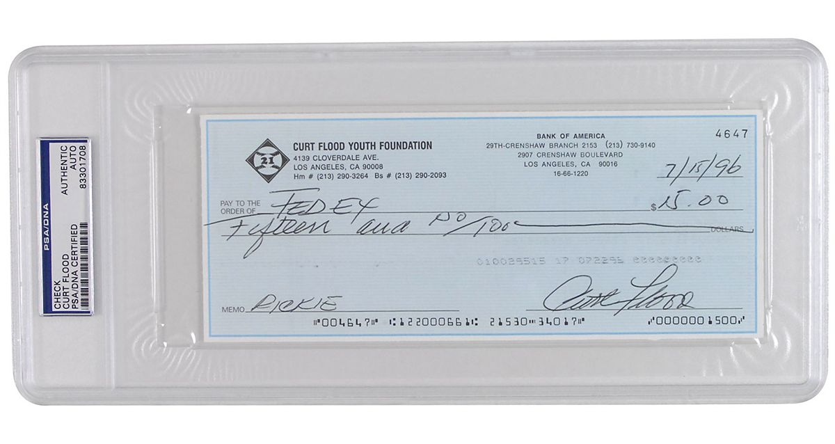 Two checks: Curt C. Flood Enterprises business check, 8.5 x 3.5, filled out in type and signed by Flood, payable DWP for $300.00, October 8, 1993; and a Curt Flood Youth Foundation business check, 8.5 x 3.5, filled out and signed by Flood, payable to Fedex for $15, July 15, 1996. Both encapsulated in a plastic PSA/DNA authentication holder. In overall fine condition.