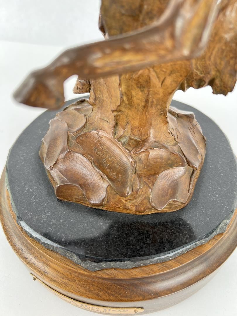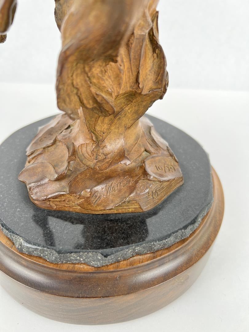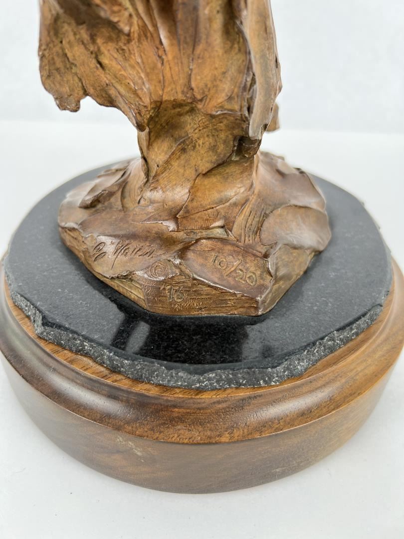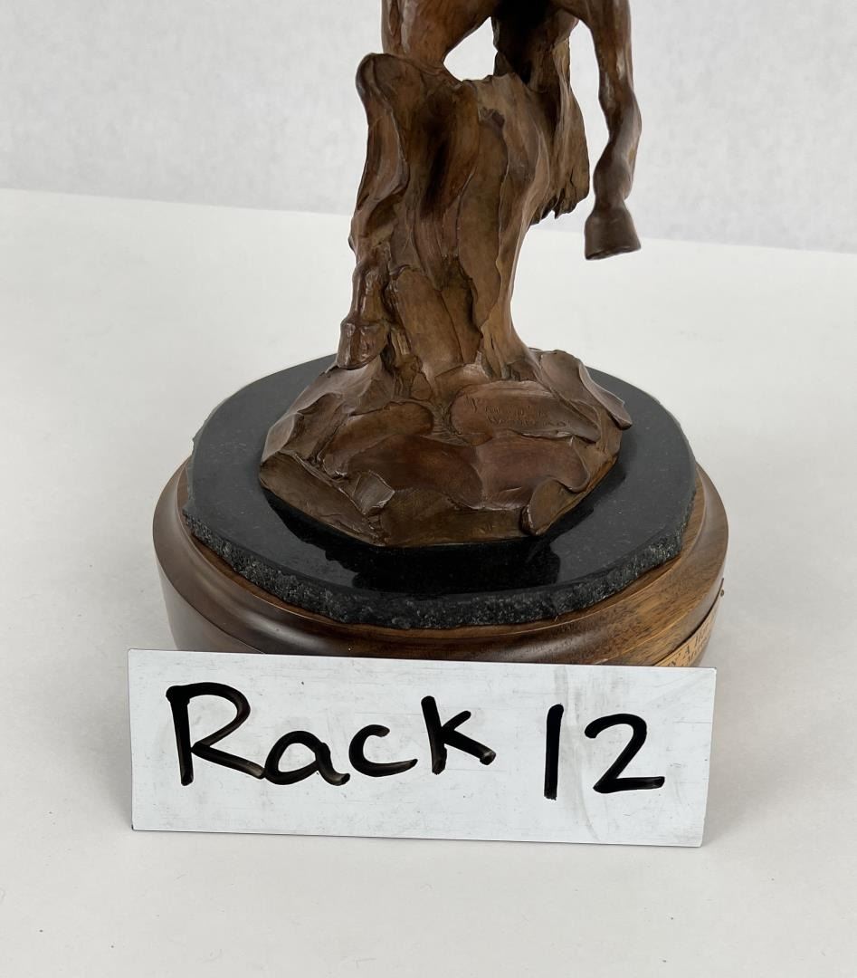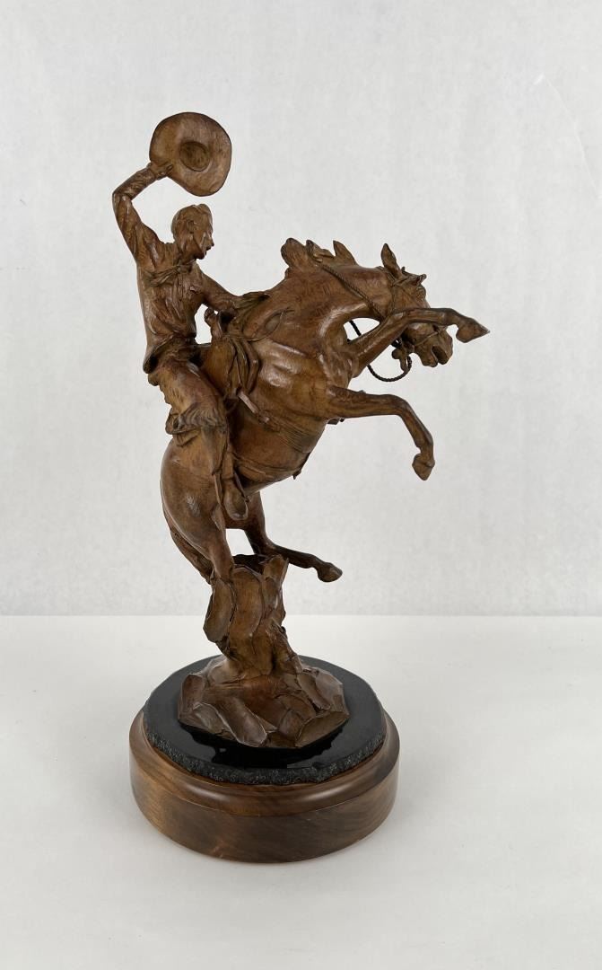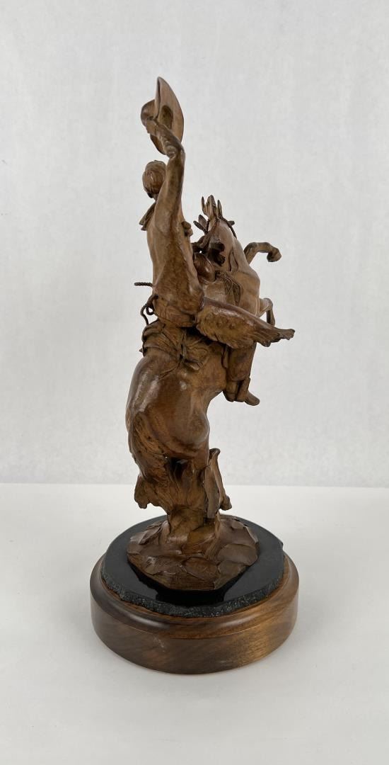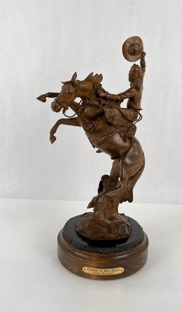 Title is Fannin' a Hot Head. 17" tall, 7 3/8" diameter. Curt Mattson (Born 1956) is active/lives in Arizona, California. Curt Mattson is known for Cowboy art-painting and sculpture. Arizona Cowboy artist Curt Mattson trained under Mehl Lawson and Pat Haptonstall to learn the art of sculpture. He has worked as a horse trainer and ranch hand since high school where he learned all about horses and western genre. Mattson was awarded the Phippen Family Award, the Best of Show and the Sculpture Award at the 2005 Phippen Museum Western Art Show in Prescott, Arizona.