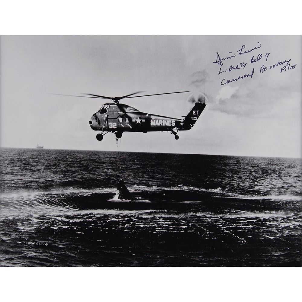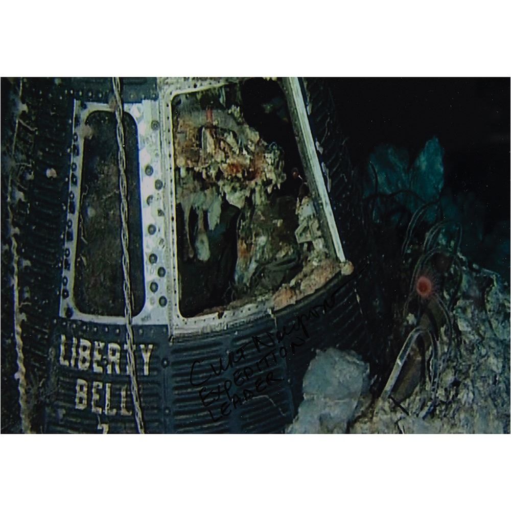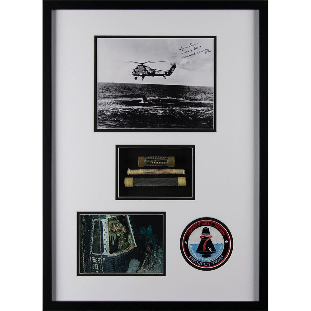 The cables are mounted together and displayed with an embroidered “Liberty Bell Seven Project Team†patch and glossy photos of the capsule—during the first recovery attempt and at the bottom of Blake’s Basin—that are signed individually in black felt tip, “Jim Lewis, Liberty Bell 7, Command Recovery Pilot†and “Curt Newport, Expedition Leader.†Matted and framed together to an overall size of 18 x 25; the frame backing has been numbered, signed, and dated in pencil by Newport, “003, C. Newport, 5 July 2022.â€