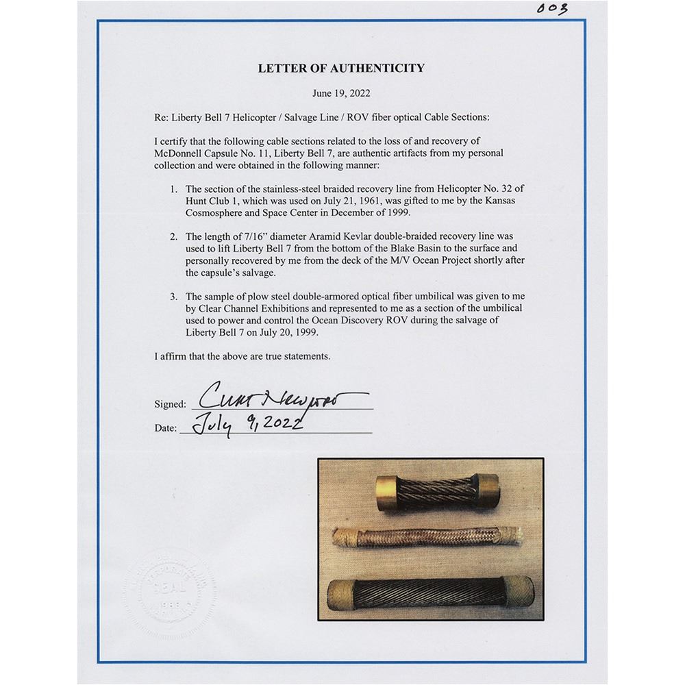 Accompanied by a signed letter of authenticity from Newport, who states that “the following cable sections related to the loss of and recovery of McDonnell Capsule No. 11, Liberty Bell 7, are authentic artifacts from my personal collection."
