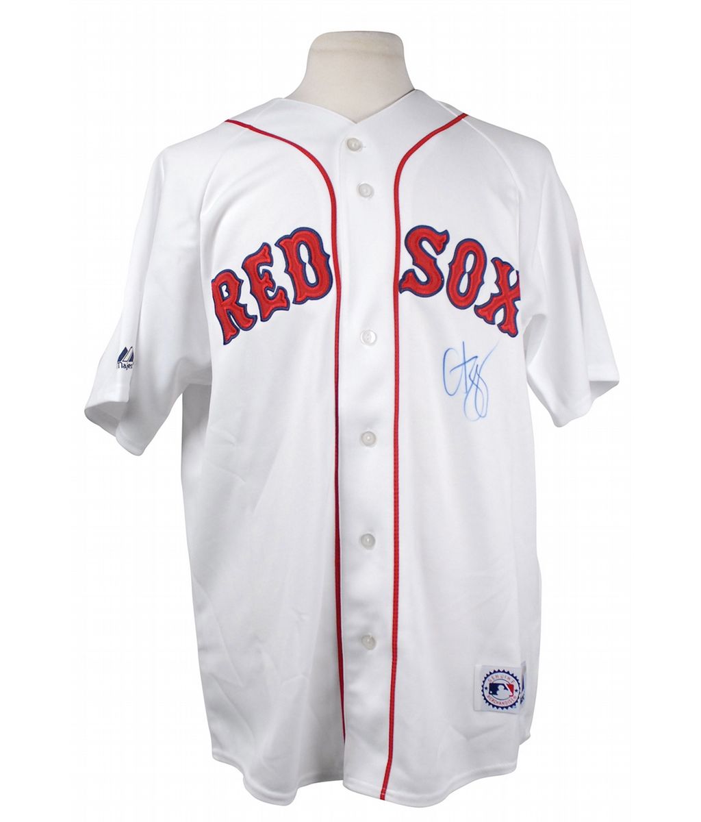 Official Majestic replica Boston Red Sox baseball jersey, with sewn on letters and numbers, signed in blue felt tip on the front. In fine condition, with a Steiner Sports label affixed to the tag. Accompanied by a certificate of authenticity from Steiner Sports.