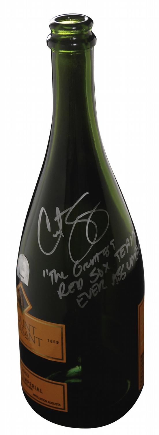 Empty bottle of 2003 Mount Pleasant Brut Imperial wine, acquired from the Busch Stadium visitor’s locker room after the Boston Red Sox 2004 World Series Championship. Signed in silver paint pen, “Curt Schilling. ‘The Greatest Red Sox Team Ever Assembled’”—a reference to the team’s toast after the Carmines overcame the Curse of the Bambino. In very fine condition, with an MLB numbered hologram affixed to the bottle—one of only 69 bottles to be saved and inventoried by MLB. A celebratory remnant from the end of an 86-year World Series drought in Boston.