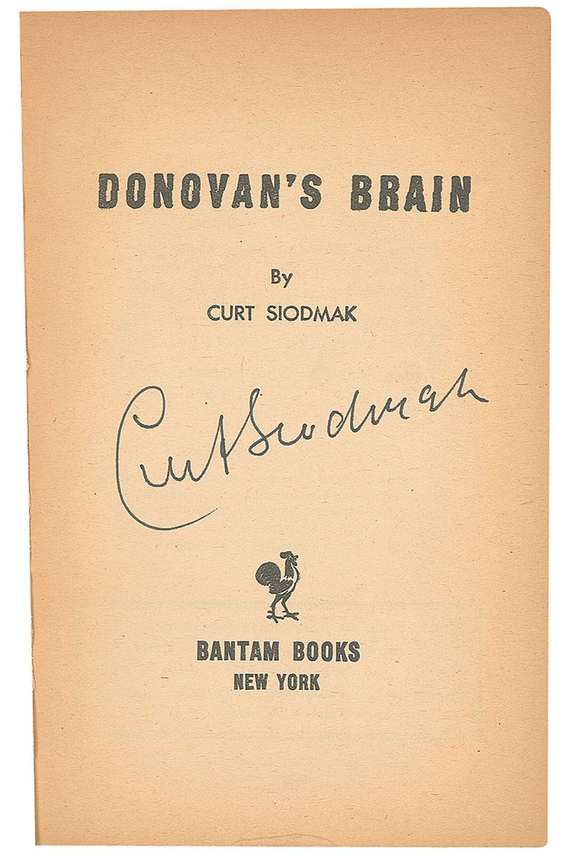 Novelist and screenwriter (1902–2000) known for writing horror and sci-fi films, most notably The Wolf Man and Donovan’s Brain. Signed book: Donovan’s Brain. First paperback edition. NY: Bantam, 1950. Paperback, 4.5 x 6.5, 181 pages. Signed on the title page in black ink. Scattered wear and soiling to covers and uniform toning to inside pages, otherwise fine condition. Consignor notes signature was obtained by a book dealer at the New York Paperback Show in the early 1990s where Siodmak had a booth for years.