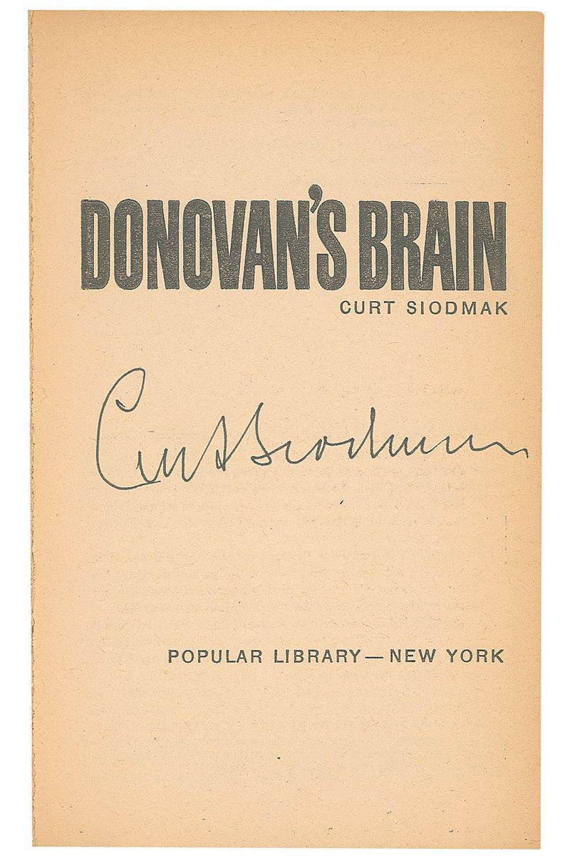 Novelist and screenwriter (1902–2000) known for writing horror and sci-fi films, most notably The Wolf Man and Donovan’s Brain. Signed book: Donovan’s Brain. Later printing. NY: Popular Library, 1961. Paperback, 4.25 x 7, 160 pages. Signed on the title page in black ink. Some light wear to covers and uniform mild toning to inside pages, otherwise fine condition. Consignor notes signature was obtained by a book dealer at the New York Paperback Show in the early 1990s where Siodmak had a booth for years.