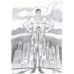 Curt Swan - Superman #201 Cover Recreation (DC, 1994). After Joe Shuster, the artist most commonly associated with the Man of Steel is Curt Swan, who defined the look of Superman for an entire generation of fans. Heroic yet human, untouchable yet vulnerable, Swan was able to illustrate a character that was both familiar and alien at the same time. While Superman was an icon, Clark Kent was just a mild-mannered everyman. Nowhere is this dichotomy more clear than on the classic cover recreated here, in which "Clark Kent Abandons Superman!" Fully rendered in lush, fluid pencils on artboard, this piece is a true homage to the Man of Tomorrow. It measures approximately 18" x 25" and is signed by the artist in the lower right corner. A large color copy of the original cover (in several pieces) also signed by Swan, is included with this lot.  Important notice: We expect to be auctioning lots at the rate of 200-250 per hour. Sometimes eBay Premier live bid software cannot keep up with that pace, so we strongly recommend that you place a realistic proxy bid now as insurance to avoid disappointment. Also please note that all Heritage/CAA lots purchased through eBay Premier carry a 20% Buyer's Premium.