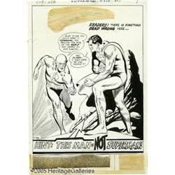 <B>Curt Swan and George Roussos - Superman #220, page 1 Original Art (DC, 1969).</B></I> The Superman-Flash crossovers were always a special treat for Silver Age fans. Usually the two Super Friends raced to prove who was the fleetest of foot, but this time the splash warns, "Readers: there is something dead wrong here. Hint: This man is <I>not</B></I> Superman!" Be that as it may, this Curt Swan splash for "Who Stole My Super Powers?" showcases sensational full-figure portraits of two of DC's most enduring costumed characters. The cover has an image area that measures 10" x 13.5". The title logo has slipped off the page, leaving a mild glue stain behind, and the indicia stat has darkened with age; otherwise the art is in Very Good condition. Don't hesitate DC collectors, race to put in your bid on this Decidedly Cool splash!