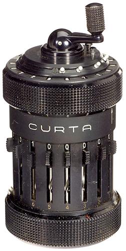 Curta Type I Vierspezies-Staffelwalzen-Miniaturrechenmaschine, die Curt Herzstark, Wien/Liechtenstein, konstruierte und in Liechtenstein produzierte. Kurbel hakt etwas (verharzt), ohne Löschung. – Relativ niedrige Serien-Nr. 11.039. Mit Original-Metalldose. – Interessantes Sammlungsstück! With original metal box. No release ring. – Relatively low serial number: 11,039. – (2/3) – € 200/350 – (129/14)
