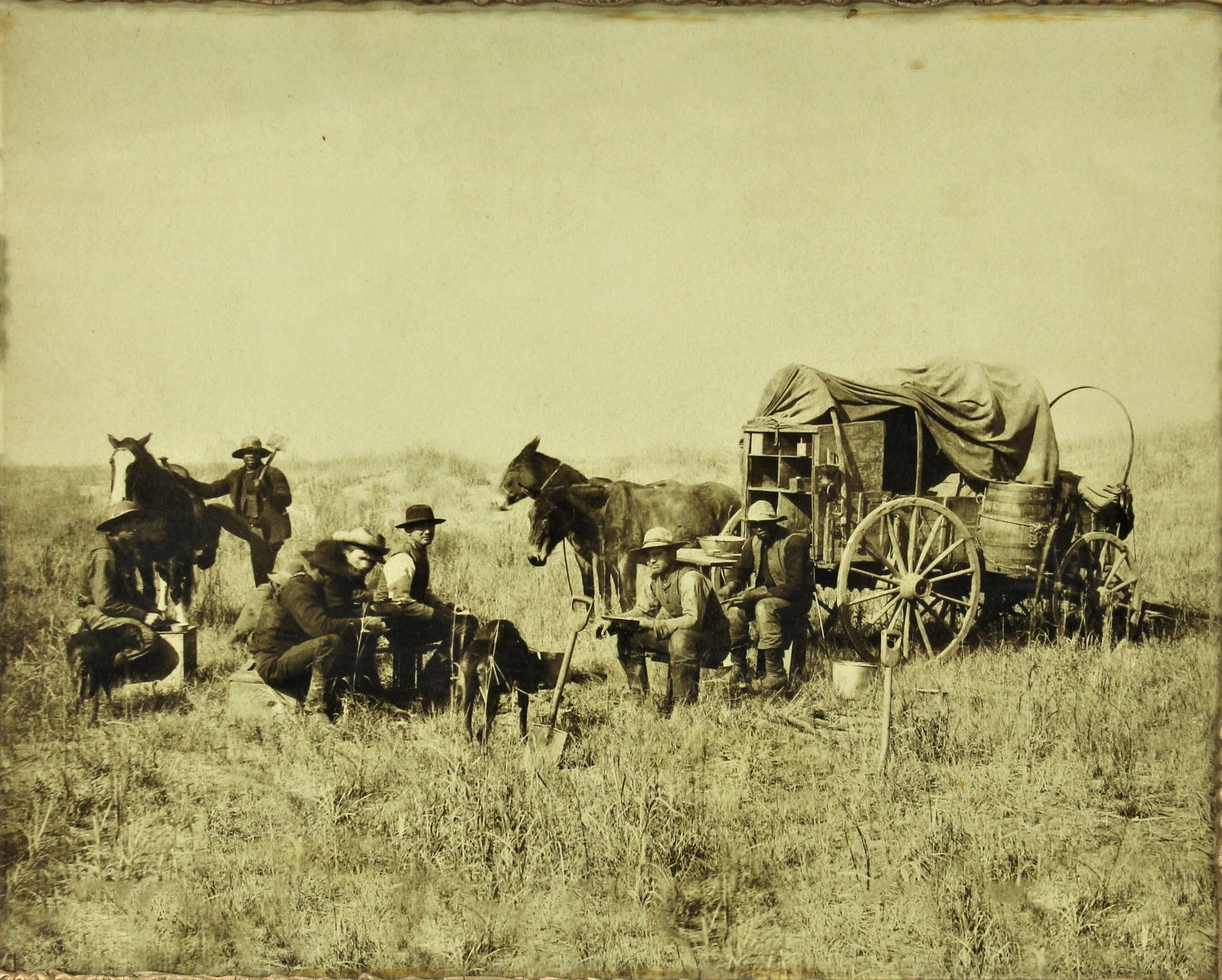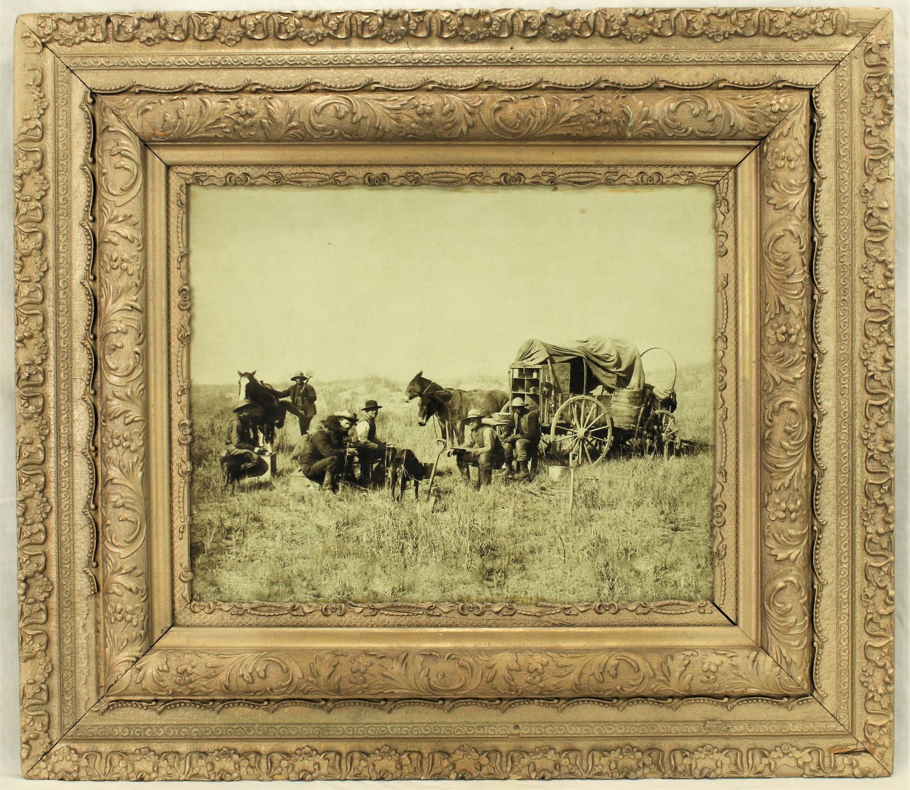 Dramatic Curtis print depicting cowboys on the range with their chuckwagon, nicely framed in antique frame, dimensions 20"x 16".