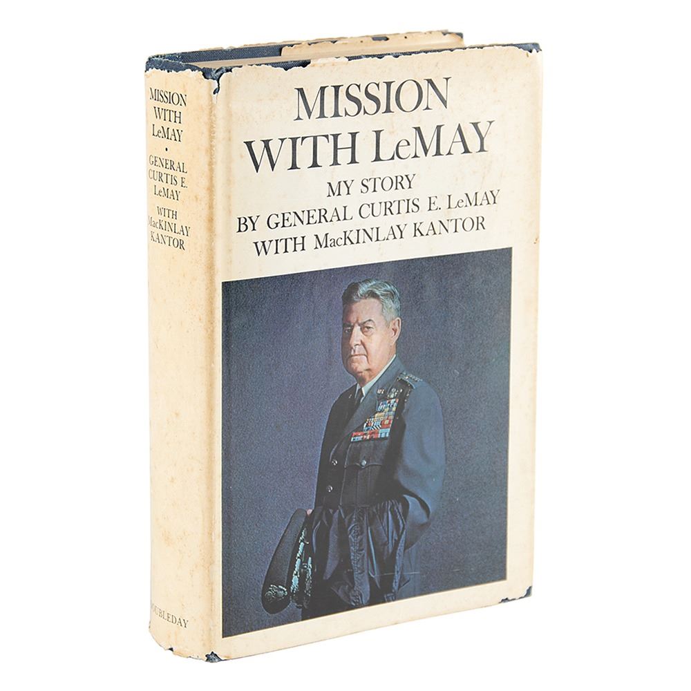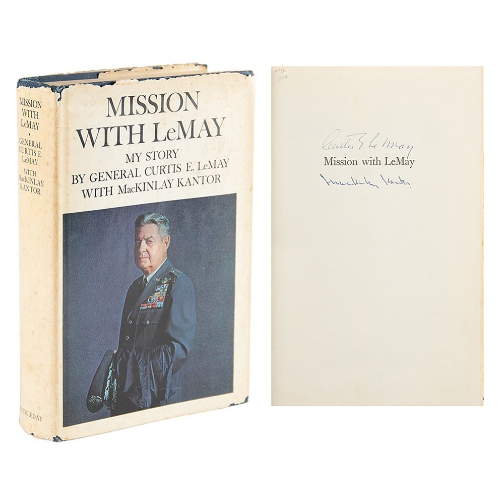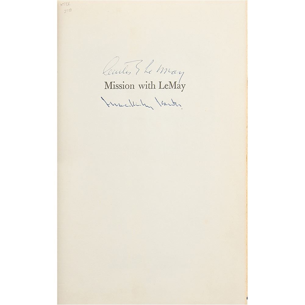Signed book: Mission with LeMay: My Story. First edition. NY: Doubleday, 1965. Hardcover with dust jacket, 6.5 x 9.5, 581 pages. Signed on the half-title page in ballpoint by Curtis E. LeMay and by the co-author, MacKinlay Kantor. In very good to fine condition, with noticeable spotting and paper loss to the dust jacket, and some wear to the edges of the binding.