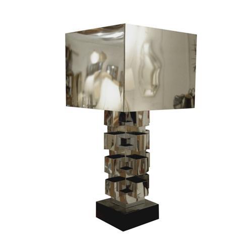 Description: Large Curtis Jere lamp, signed. Architectural chrome column with matching chrome shade.