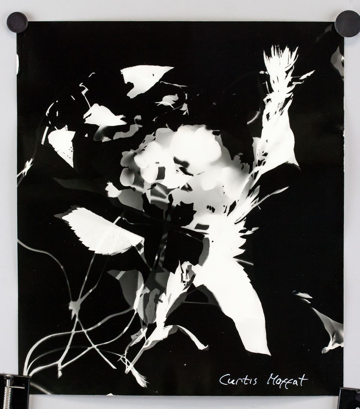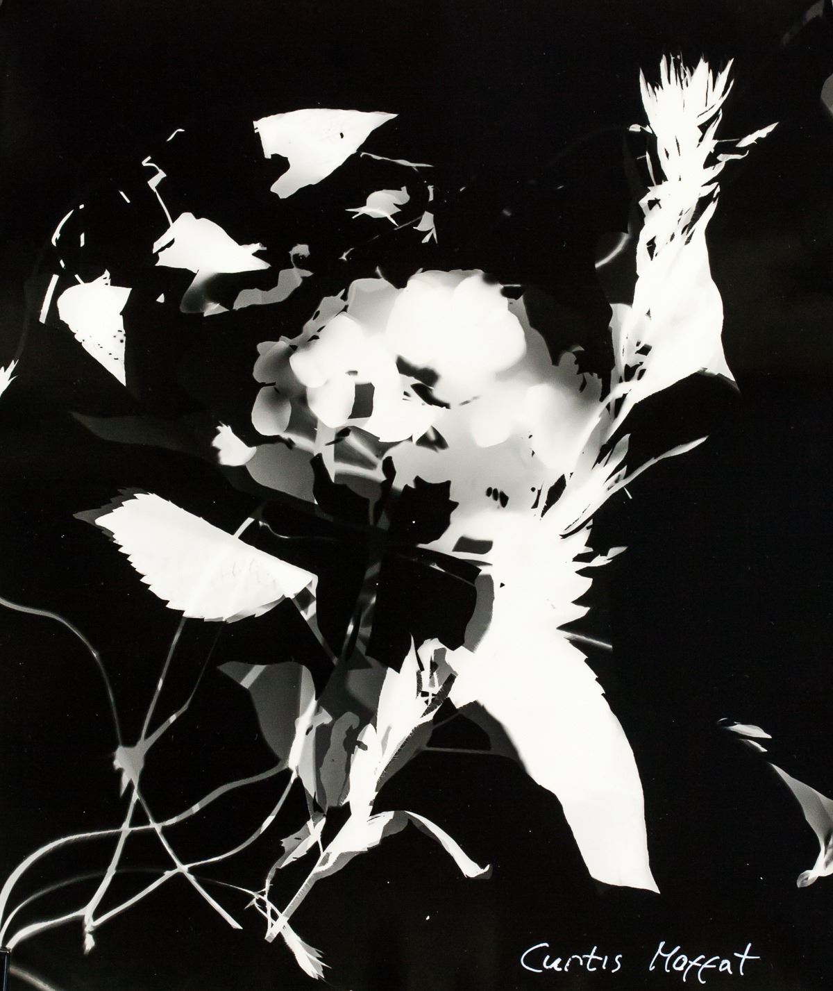 Photogram on paper. Featuring an abstract composition. Signed Curtis Moffat on the lower right corner. Attributed to Curtis Moffat (1887-1949, American). 34 x 30 cm (13.5 x 11.75 inches). PROVENANCE: This lot carries limited provenance from an Upper New York estate