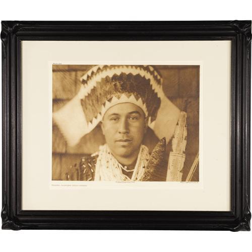 <B>Edward S. Curtis Original Portfolio Photogravure "Tolowa Dancing Head-Dress" Plate 455</B></I> on Japanese Rice Tissue mounted on vellum, copyright 1923. Original image size 15.25" x 12" with the plate number at upper left, title at lower left, and captioned at the bottom "From Copyright Photograph 1923 by E. S. Curtis" and "Photogravure Suffolk Eng. Co. Cambridge, Mass." Matted and custom framed to an overall size of 25.5" x 21.5". The Tolowa lived in the Smith River basin in Northwestern California and in Southwestern Oregon. They were photographed by Curtis and included in Volume 13 of <I>The North American Indian</B></I> where he wrote "The head dress is of a type common to the Klamath River tribes - a broad band of deerskin partially covered with a row of red scalps of the woodpecker. The massive necklace of clamshell beads indicates the wealth of the wearer, or of the friend from whom he borrowed it. He carries a ceremonial celt of black obsidian and a decorated bow." Excellent condition.<BR><BR><b>Shipping:</b> Framed - with Glass, Medium (<a target="_blank" href="http://www.heritageauctions.com/common/shipping.php">view shipping information</a>)