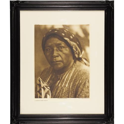 <B>Edward S. Curtis Original Portfolio Photogravure "A Coast Pomo Woman" Plate 483</B></I> on Japanese Rice Tissue mounted on vellum, copyright 1924. A beautiful original image of 11.5" x 15.25" with the plate number at upper left, title at lower left, and captioned at the bottom "From Copyright Photograph 1924 by E. S. Curtis" and "Photogravure Suffolk Eng. Co. Cambridge, Mass." Matted and custom framed to an overall size of 21.5" x 25.5". The Pomo people lived on the Pacific Coast in the northern San Francisco Bay area and Curtis told their story in Volume 14 of his legendary <I>The North American Indian</B></I> where he described this woman, "The woman's dice game, kadaii, is very popular. The kadaii, are six half round pieces of willow about eight inches long, all marked alike on the rounded side. These are cast downward and forward upon a piece of deerskin, and one tally stick is gained if they lie evenly divided, while two points are scored if all face one way. No other combinations count. Two women play at this game, with betting on the side by numerous women spectators as well as by the contestants themselves. So long as a player scores, she continues to cast." Excellent condition.<BR><BR><b>Shipping:</b> Framed - with Glass, Medium (<a target="_blank" href="http://www.heritageauctions.com/common/shipping.php">view shipping information</a>)