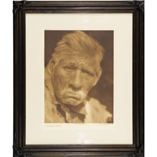 <B>Edward S. Curtis Original Portfolio Photogravure "A Yauelmani Yokuts" Plate 498</B></I> on Japanese Rice Tissue mounted on vellum, copyright 1924. Original image size 11.25" x 15.25" with the plate number at upper left, title at lower left, and captioned at the bottom "From Copyright Photograph 1924 by E. S. Curtis" and "Photogravure Suffolk Eng. Co. Cambridge, Mass." Matted and custom framed to an overall size of 21.5" x 25.5". The Yokut lived in Central California from the San Joaquin Valley south to Bakersfield. They were photographed by Curtis and included in Volume 14 of <I>The North American Indian.</B></I> He writes, "The Yauelmani formerly lived in the planes north of Kern Lake. The survivors are on Tule River Reservation in Tulare County." Excellent condition.<BR><BR><b>Shipping:</b> Framed - with Glass, Medium (<a target="_blank" href="http://www.heritageauctions.com/common/shipping.php">view shipping information</a>)