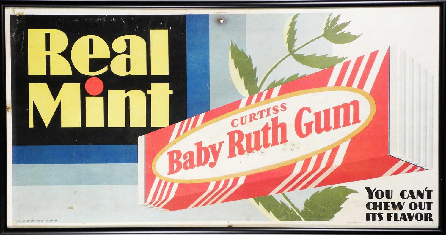 Curtiss Baby Ruth Chewing Gum Trolley Car Sign. Framed under glass. Nail hole at 12:00, wrinkles at 10/4:00 and small holes in chewing gum pack otherwise good condition. 20 1/2 X 10 1/2 inches.