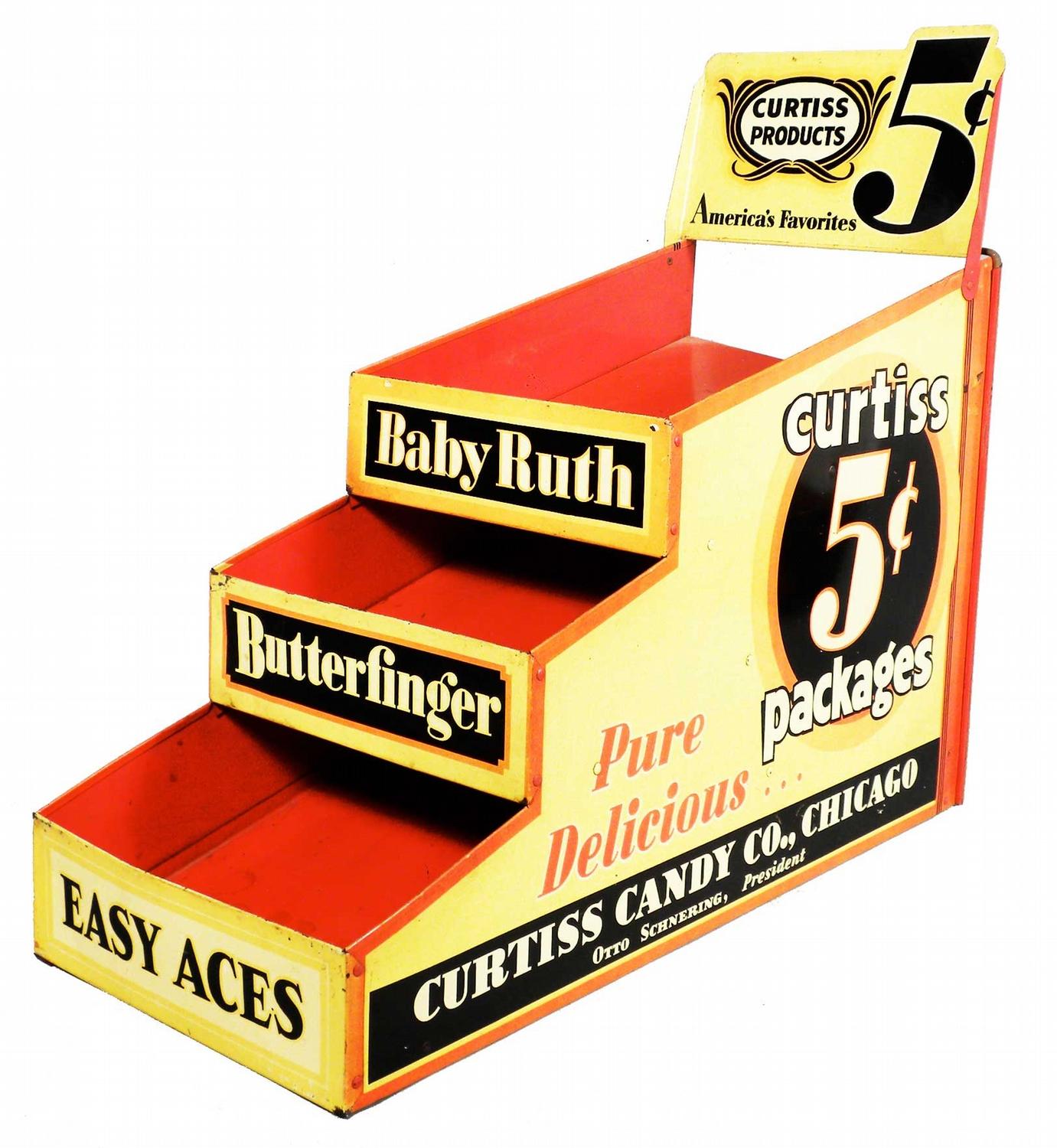 Curtiss Baby Ruth, Butterfinger and Easy Aces Tin Store Display Fixture. 5 cent packages. Some minor paint loss and edge ware otherwise excellent condition. 9 1/4 X 20 X 22 inches.