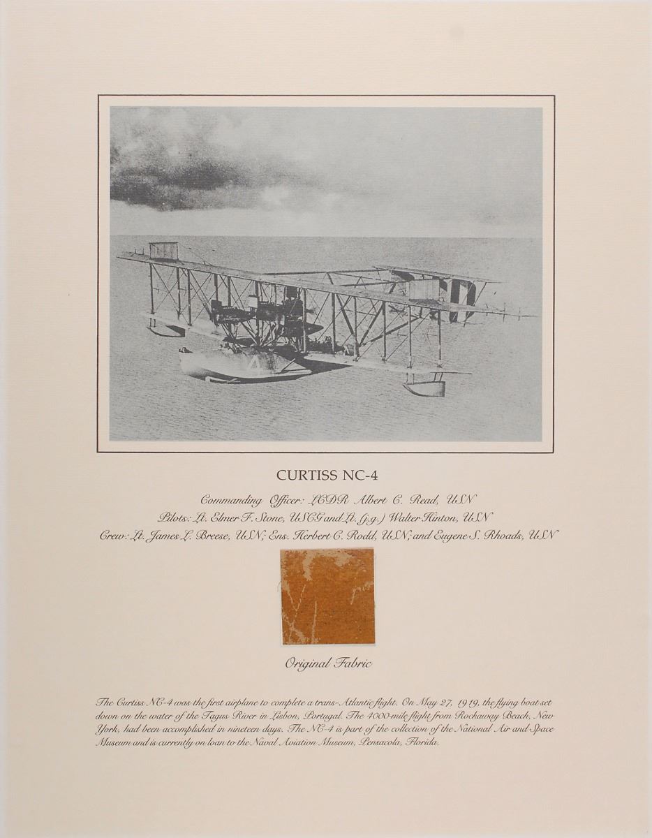 Original wing fabric swatch, 2 x 2.25, excised from the Curtiss NC-4. The brown swatch is affixed to a 15 x 20 piece of textured cover stock paper with a 10 x 8 photo of the aircraft flying over the ocean. Printed beneath the original fabric is a description of the airplane’s historic trans-Atlantic flight. In fine condition, with uniform irregular toning from previous display. The Curtiss NC-4 was the first aircraft to fly across the Atlantic Ocean.