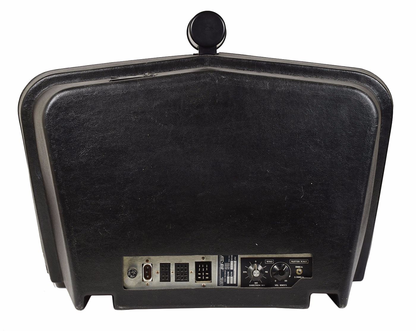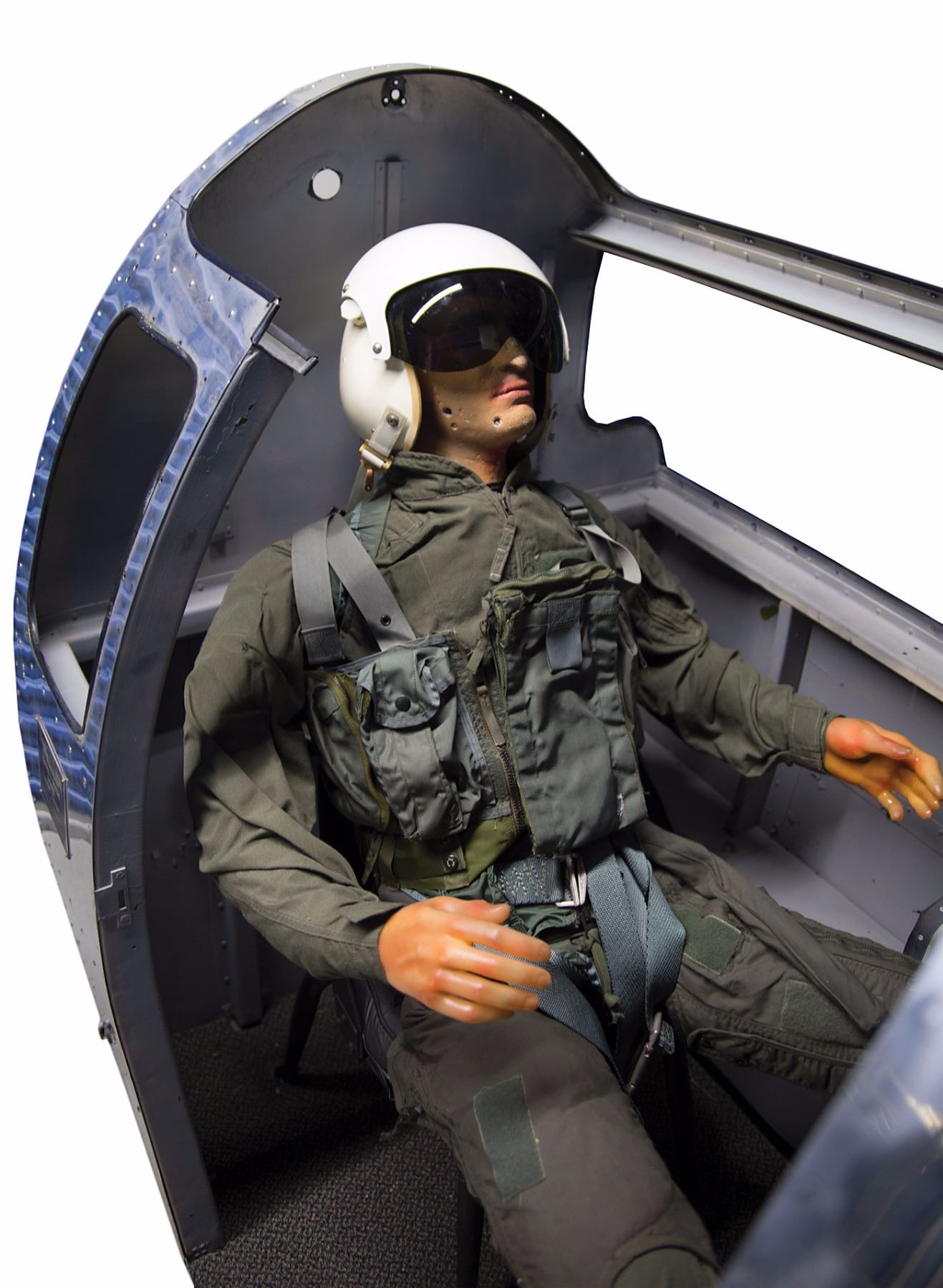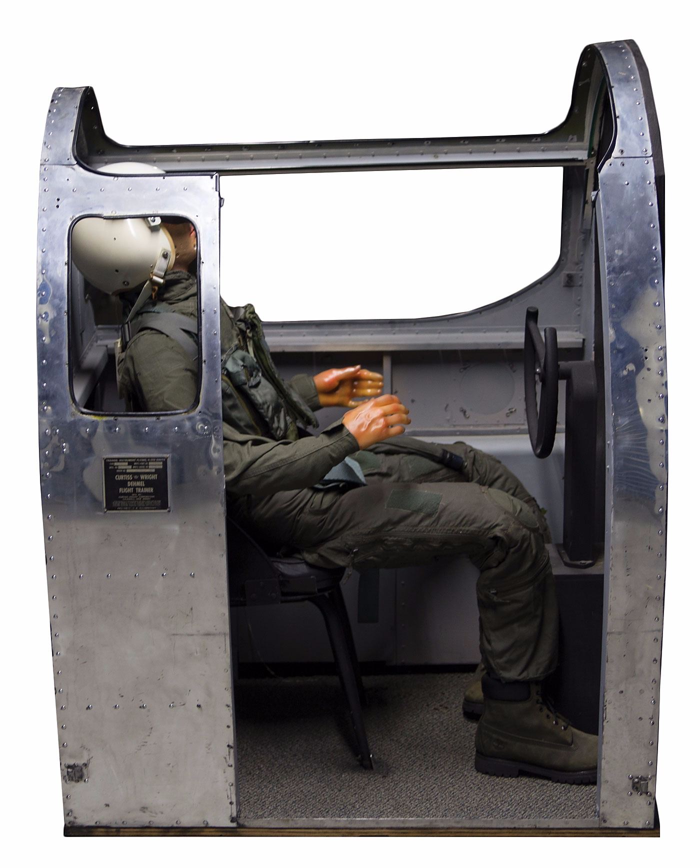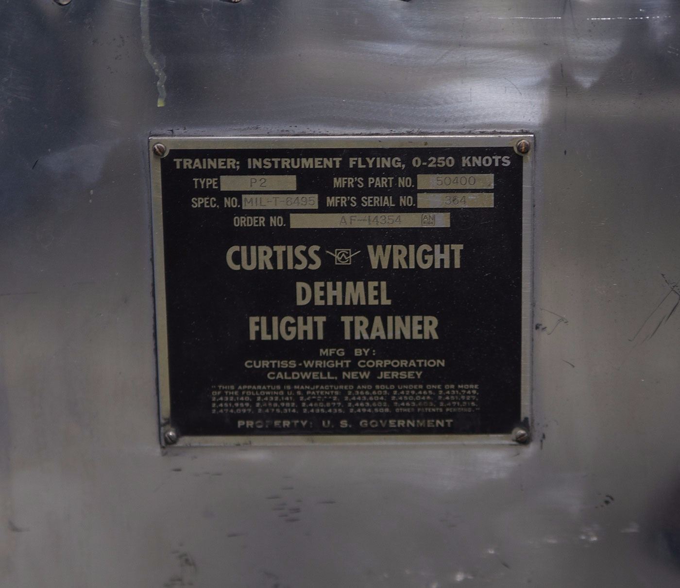 Section of an original Curtiss-Wright Dehmel Flight Trainer converted into a decorative display piece, constructed of aircraft aluminum with plywood reinforcements, measuring approximately 45 x 39 x 36, retaining its original ID plate on the side, reading: "Trainer; Instrument Flying, 0–250 Knots. Type: P2. Mfr's Part No. 50400, Mfr's Serial No. 364, Order No. AF-14354." The plate identifies the manufacturer as "Curtiss-Wright Corporation, Caldwell, New Jersey." One side of the cockpit is painted with an image of a cape-wearing tomcat flying a fighter plane with a machine gun in front, inspired by classic WWII nose art. The link trainer still has its steering wheel but is missing the instrument panel. Comes with an aviator mannequin, as well as a vintage ATC-610 Personal Flight Simulator console (working condition unknown and missing its power cable). In very good to fine condition. Invented by Richard C. Dehmel of the Curtiss Wright Corp., the Dehmel Flight Trainer was the world's first commercial electronic flight simulator with controls and instruments that accurately responded as if in flight. The simulator dramatically reduced the cost and risk of training American fighter pilots in the later part of World War II.