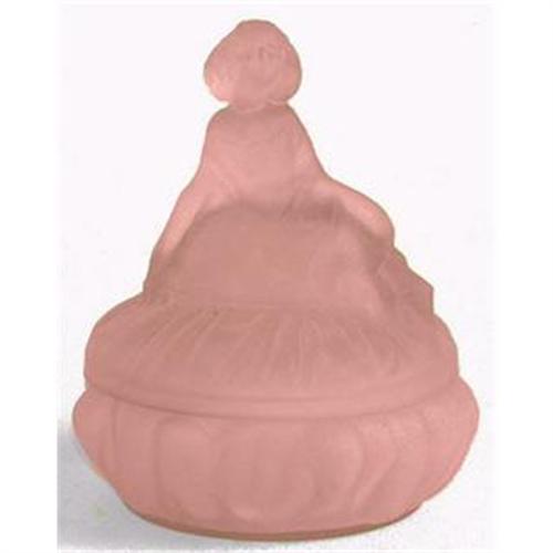 Known as Curtsy this powder jar is shown and described on page 134 of Whitmyer - Bedroom & Bathroom Glassware of the Depression Years. Featuring a figural of a smiling young girl with outstretched arms and wearing an ornate gown. Produced in lovely pink satin glass by Toussant Glass circa 1920s - 1930s. She is beautifully executed with fine definition to her features, figure and gown. Measuring 6 tall x 4 1/2 inches across the bottom and in excellent condition.
