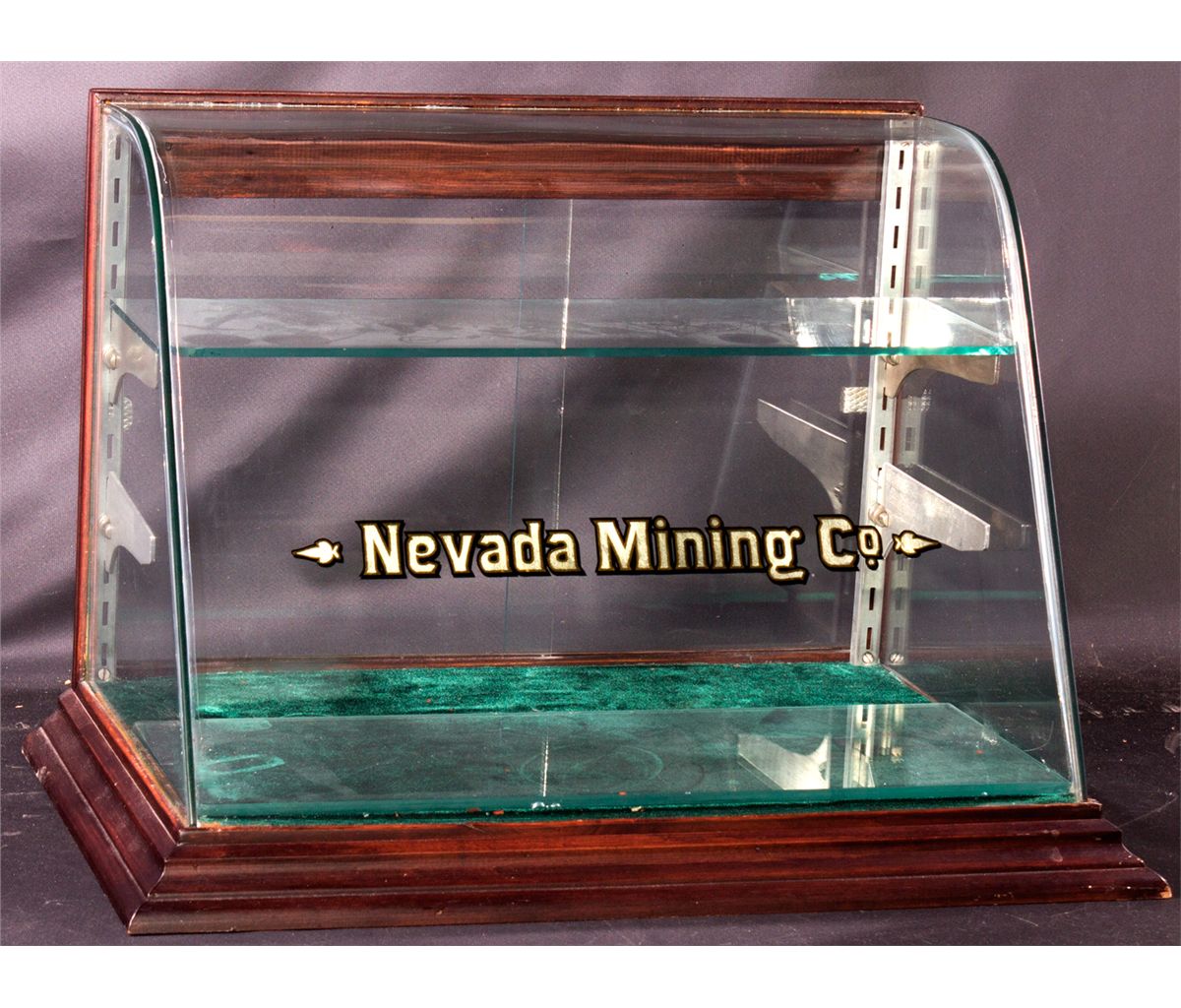 Glass and walnut display case with unique curved glass front face panel. Sliding panels at back, with 2 adjustable glass shelves inside. Green felt lined base. Base measures 15.5" deep x 23" wide. Unit is 16" high. The curved front panel is custom lettered with "Nevada Mining Co." script in gold. Very good to excellent condition. A beautiful display piece. - Jacobitz Collection -59670