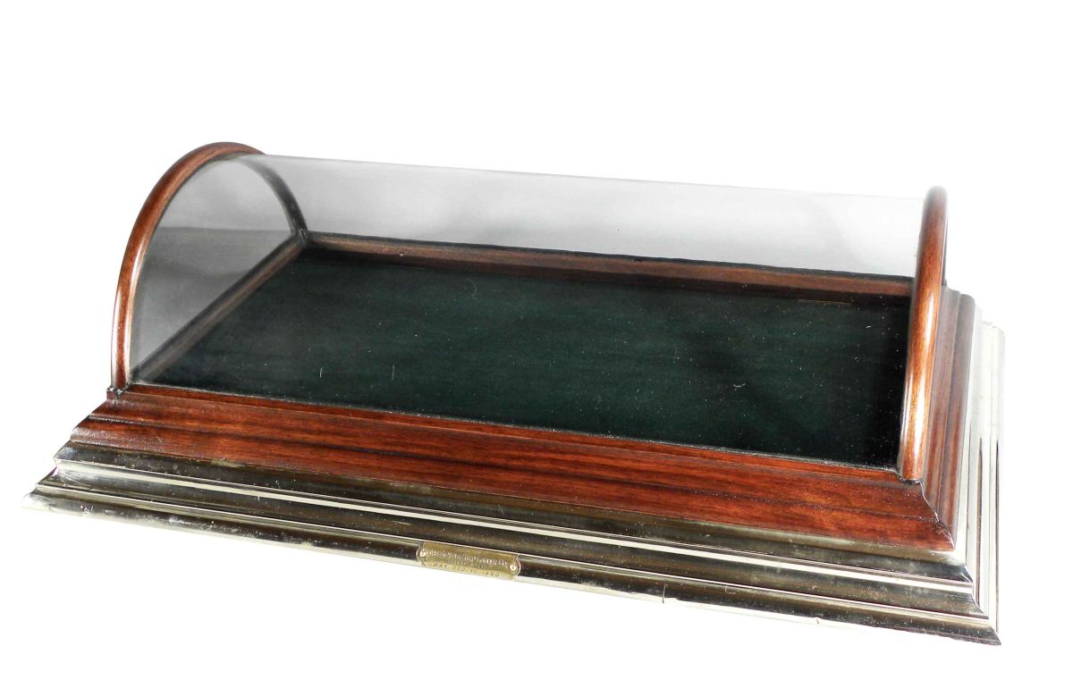 Curved Glass Counter Top Showcase. Walnut finish with nickel base. Excellent condition. 27 X 8 X 16 1/2 inches.