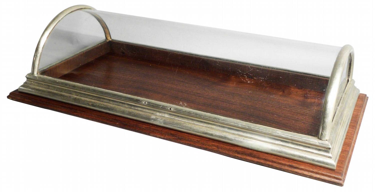 Curved Glass Nickel/Wood Counter top Showcase. Patented 1879. Good for smalls, guns and knives. Top glass is scratched otherwise good condition. 27 1/2 X 6 3/4 X 14 1/2 inches.