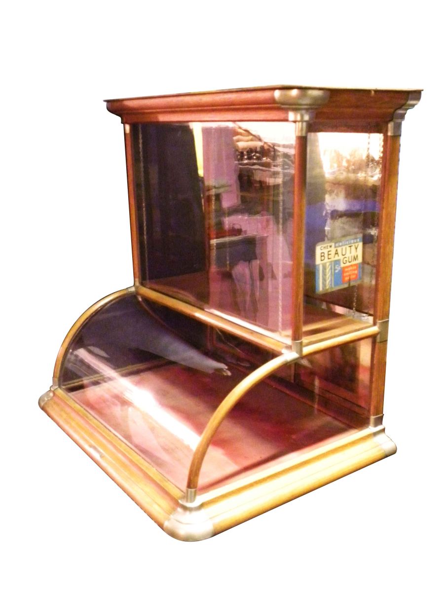 Curved Glass Single Tower Showcase. Excelsior Showcase Works, Quincy Ill. Oak with nickel corners. Very good original condition. 36 X 37 X 27 inches.