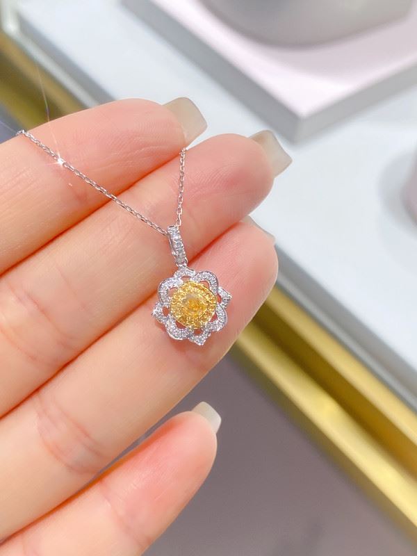 A brilliant yellow diamond rests at the heart of a delicate petal-inspired frame, encircled by curling layers of white diamonds. The graceful interplay of gold and light evokes the warmth of sunlight on a blooming flower — radiant, elegant, and timeless.Main diamond: 0.304ct, side diamond: 0.106ct. Note: Comes with an AGL certificate and a domestic jewelry identification certificate.