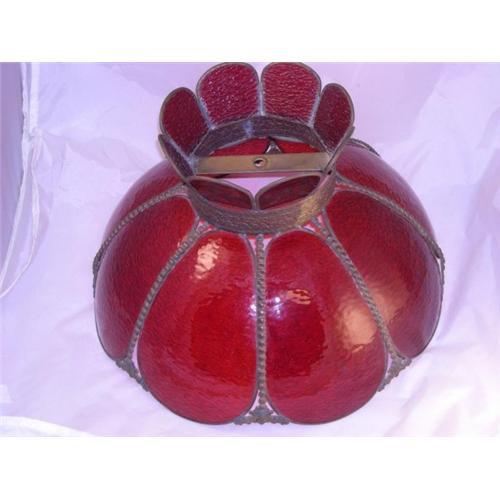 Color and Materials: This lamp shade is made of curved red slag glass and a metal with brass finish. The metal portions have very ornamental features. MEASUREMENTS: The shade measures 22 inches in width. ERA: Estimated date is 1930's or 1940's. CONDITION: Very good, with no damage to glass. Metal is fine, too. MARKINGS: No signature found.