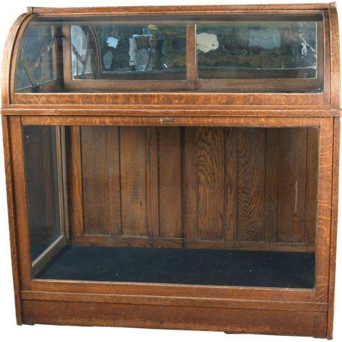 Curved front Cigar store oak display case with beveled glass top. 48" x 48" x 26"