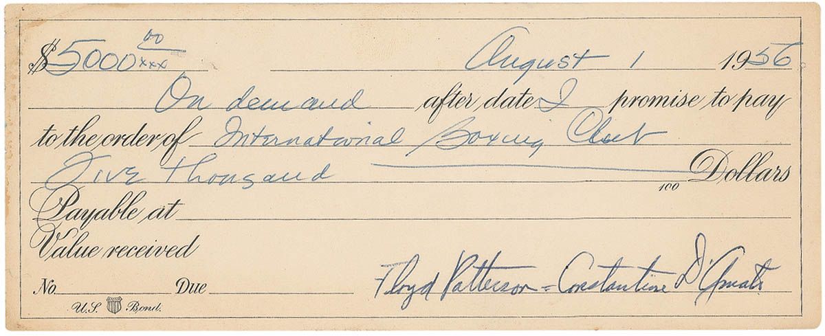 Boxing manager and trainer (1908–1985) who handled the careers of Floyd Patterson, Jose Torres, and Mike Tyson. DS, signed “Constantine D'Amato,” one page, 8 x 3.25, August 1, 1956. Promissory note to the International Boxing Club for $5000, filled out in another hand and signed by D’Amato, adding “Floyd Patterson” next to his name. In fine condition, with light toning and soiling to the borders. Later on in 1956, Patterson would win his first World Heavyweight title.
