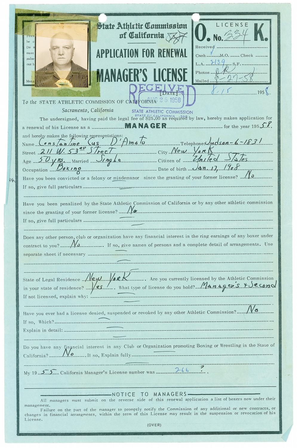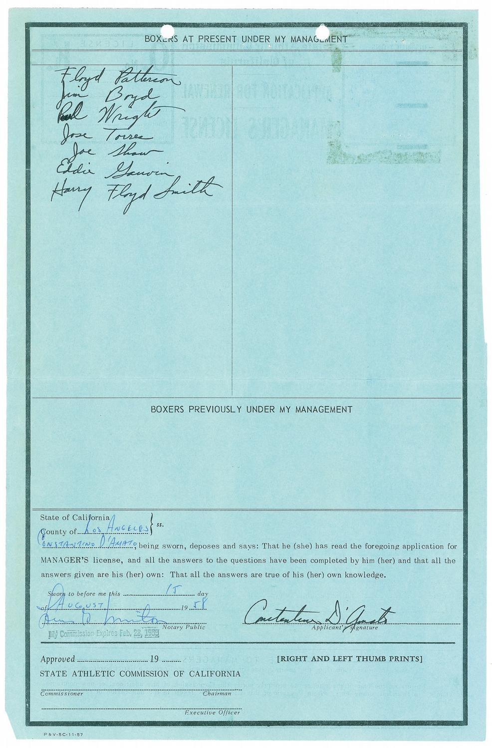 Boxing manager and trainer (1908–1985) who handled the careers of Floyd Patterson, Jose Torres, and Mike Tyson. DS, signed “Constantine D’Amato,” one page both sides, 8.5 x 13, August 15, 1958. Application for renewal for D’Amato’s manager’s license from the State Athletic Commission of California. D’Amato has printed his name, street address, and answered several application questions. Horizontal fold, corner crease, two filing punch holes, and two pieces of old tape securing his photo to the page, otherwise fine condition. A year later, D’Amato would manage Patterson during his defeat by Ingemar Johansson.