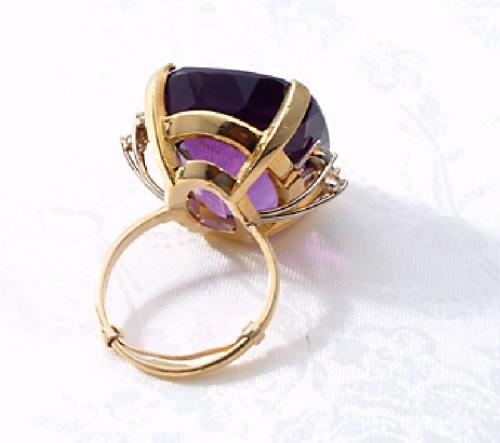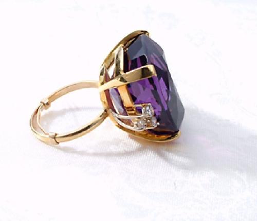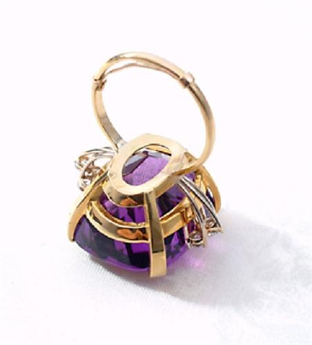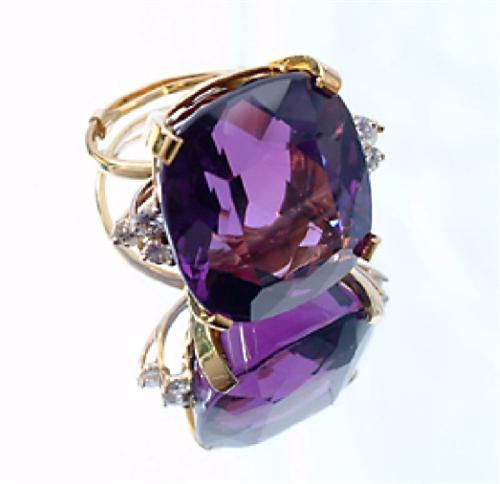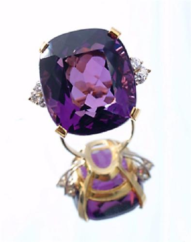 One 42.70 ct. cushion cut Amethyst, secured by four prongs. 23 mm. by 20.3 mm. by 14.85 mm. Amethyst is of purple color, dark tone, vivid saturation, slightly included. Accented by three diamonds, prong set on either side in white gold.