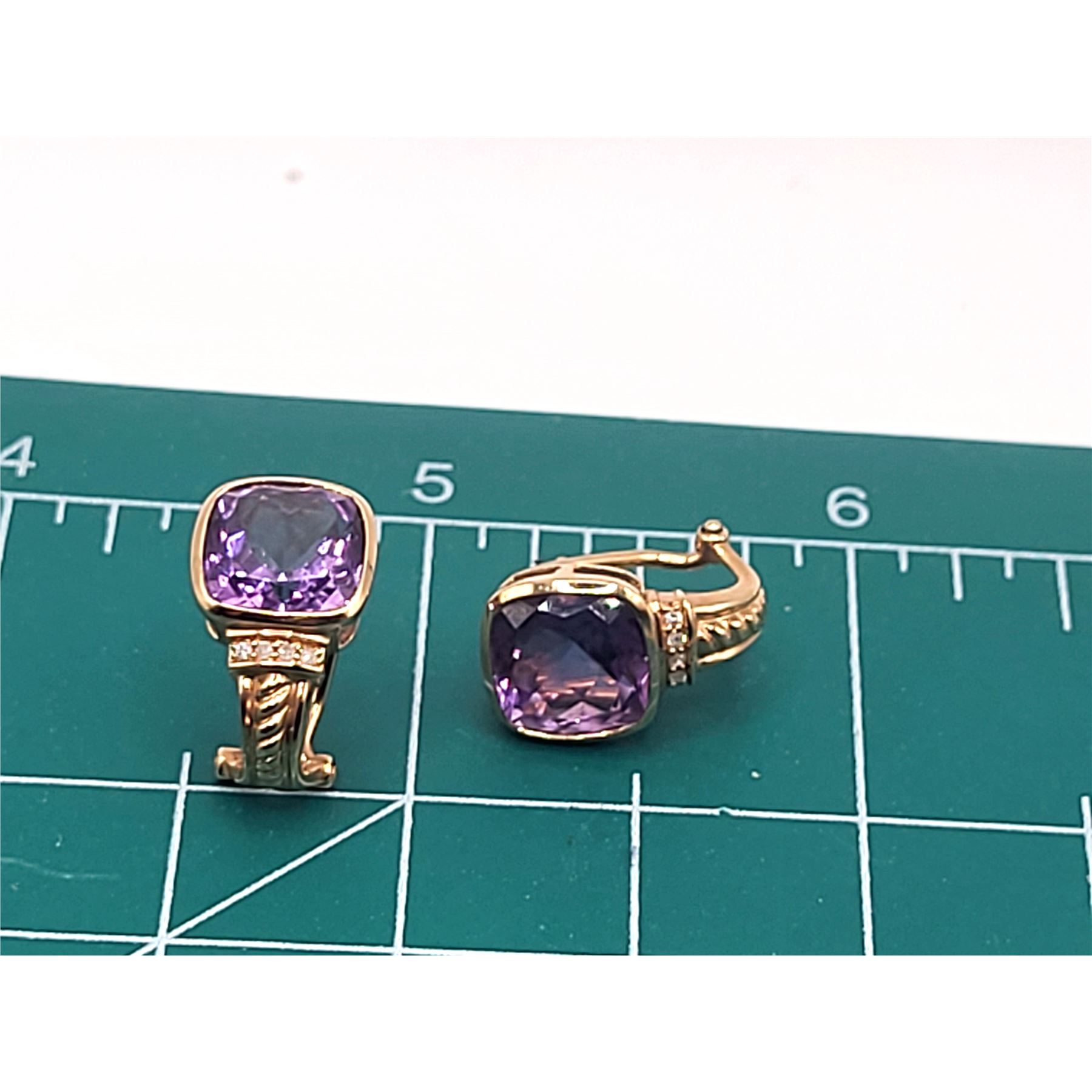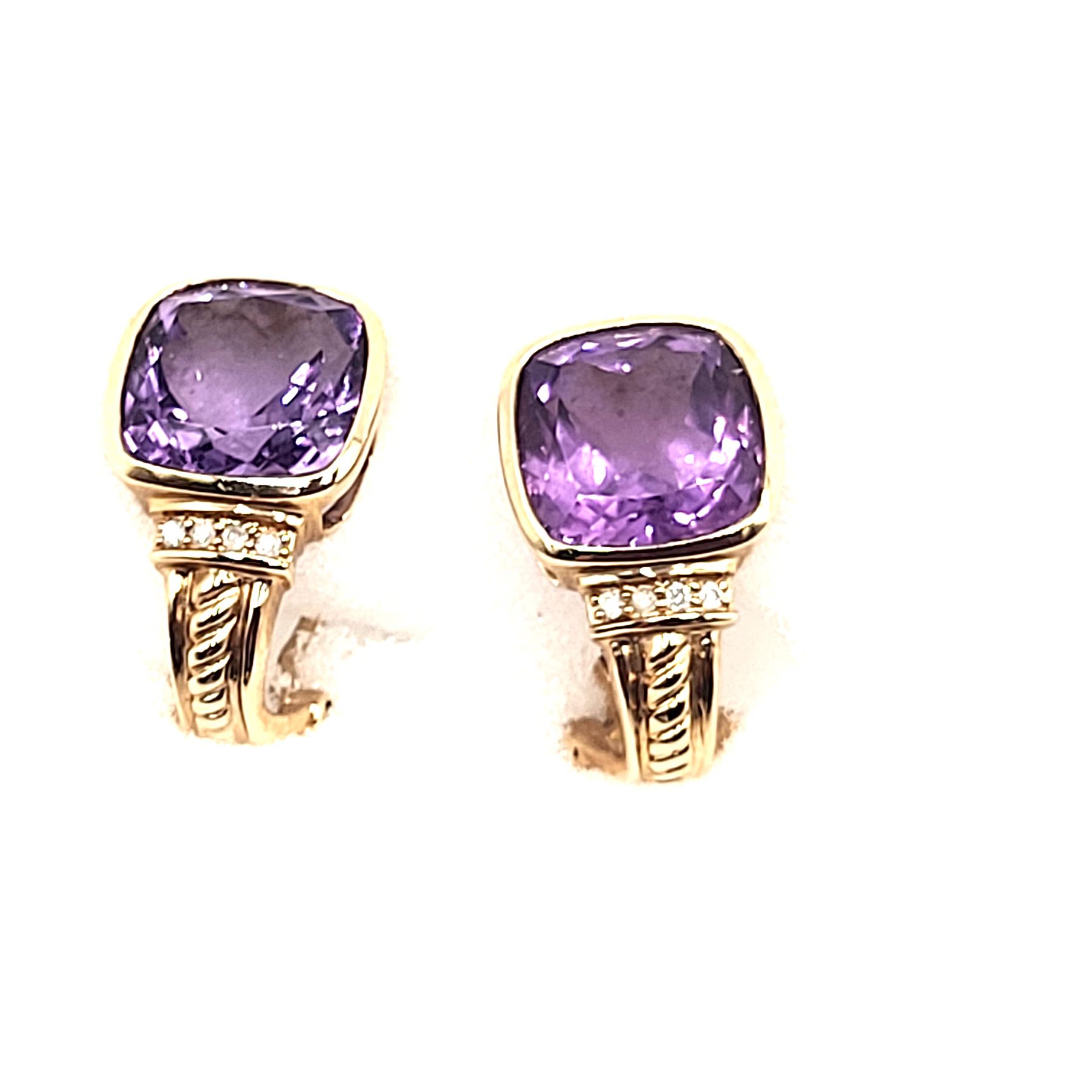 This is a pair of 14 karat yellow gold earrings, featuring 6.26 carats total weight of cushion-cut, bezel-set, genuine amethysts and .04 carats total weight of round, brilliant-cut, H, SI2, channel-set, accent diamonds. The earrings are approximately 3/4& quot; long with a twisted rope design at the bottom that curves around to the closure, which is a post and an Omega back.& nbsp;