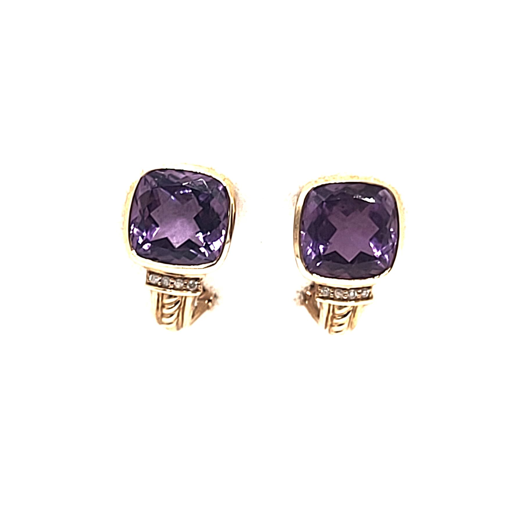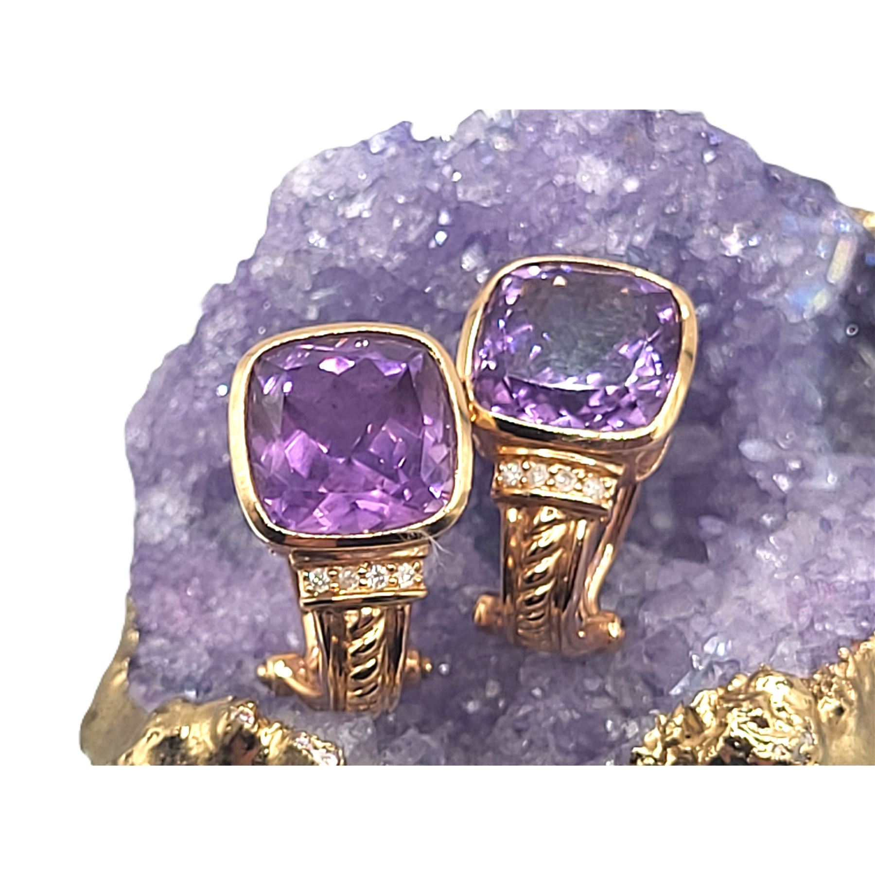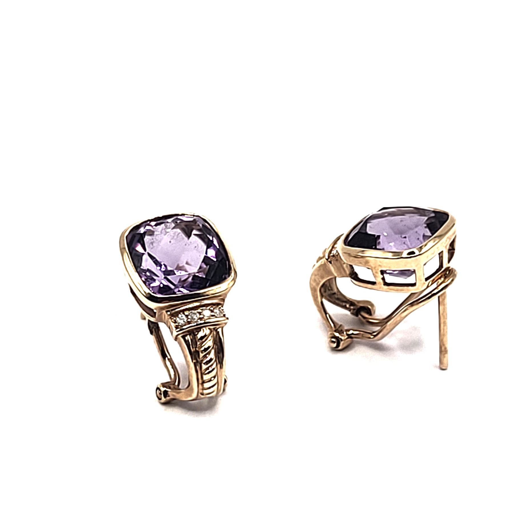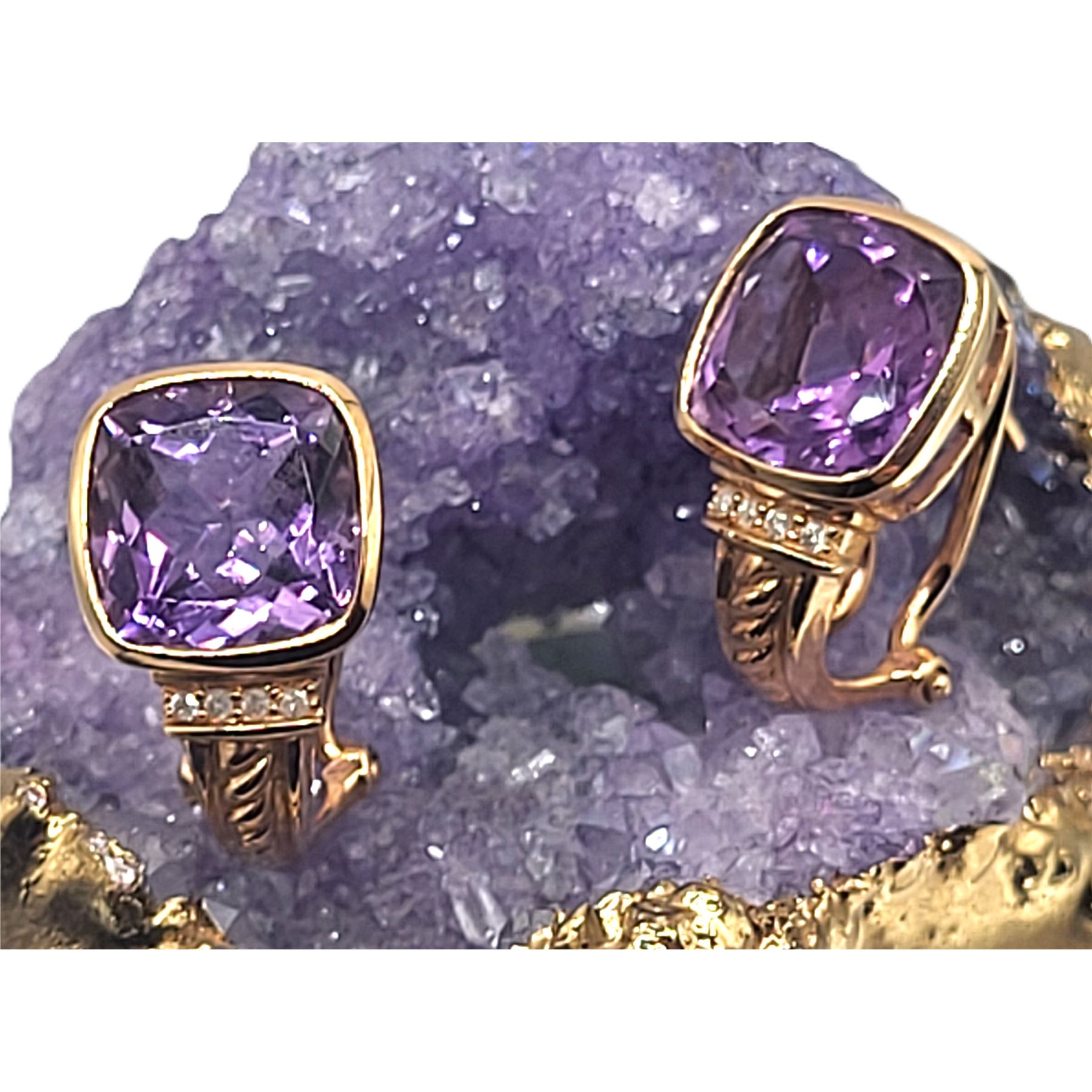 This is a pair of 14 karat yellow gold earrings, featuring 6.26 carats total weight of cushion-cut, bezel-set, genuine amethysts and .04 carats total weight of round, brilliant-cut, H, SI2, channel-set, accent diamonds. The earrings are approximately 3/4" long with a twisted rope design at the bottom that curves around to the closure, which is a post and an Omega back.