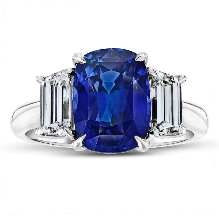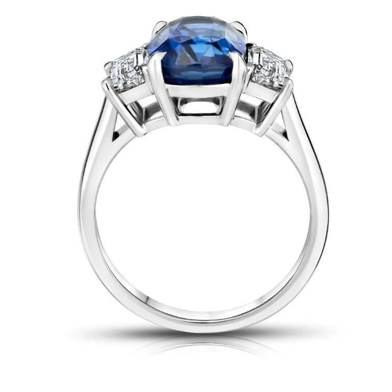 4.85 Carat Cushion Blue Sapphire Ring, with Trapezoid shape diamond side stones with a total carat weight of 1.17.