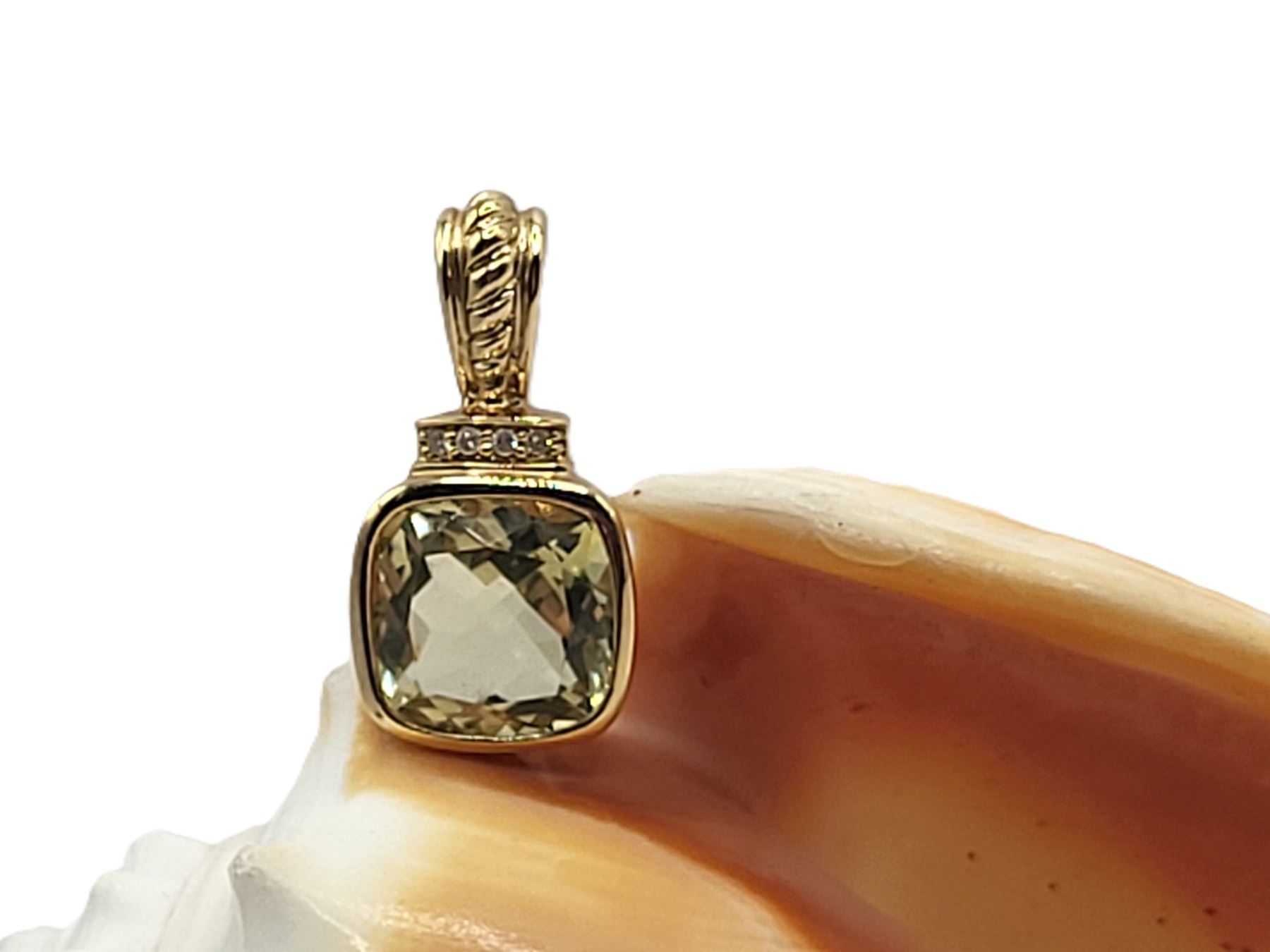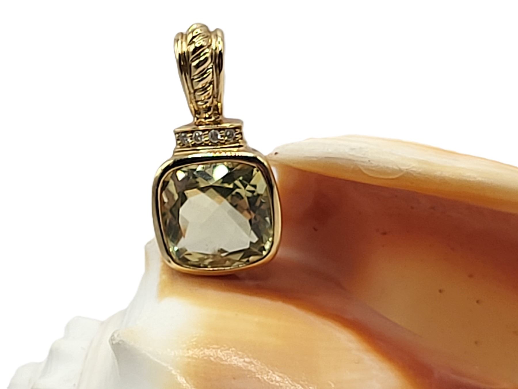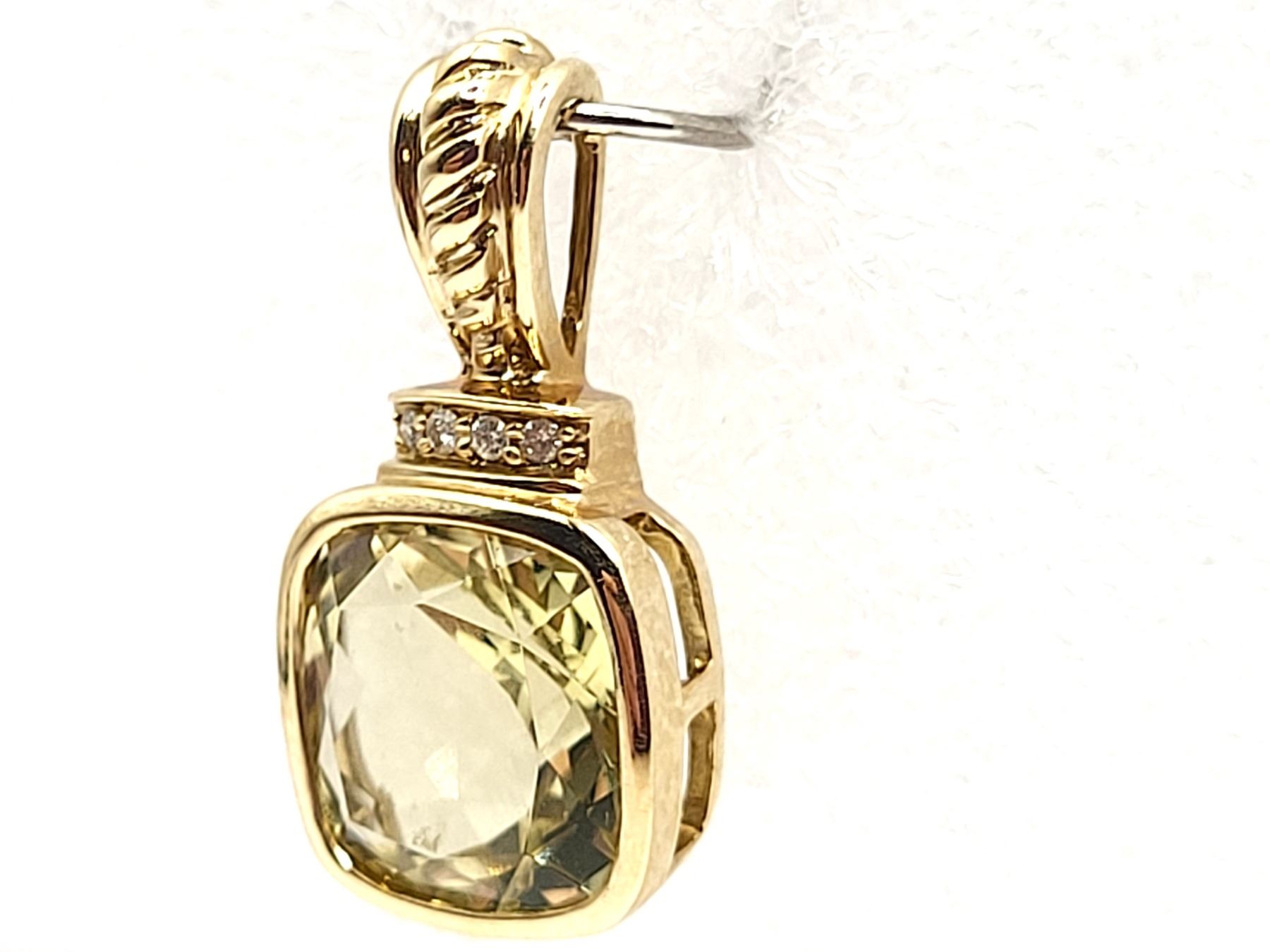 This is a pair of 14 karat yellow gold earrings that feature 6.75 carats total weight of cushion-cut, bezel-set, genuine lemon quartz and .04 carats total weight round, brilliant-cut, H color, SI2 clarity accent diamonds. These earrings have twisted rope designs at the bottoms, that curve back as part of the Omega back closure.