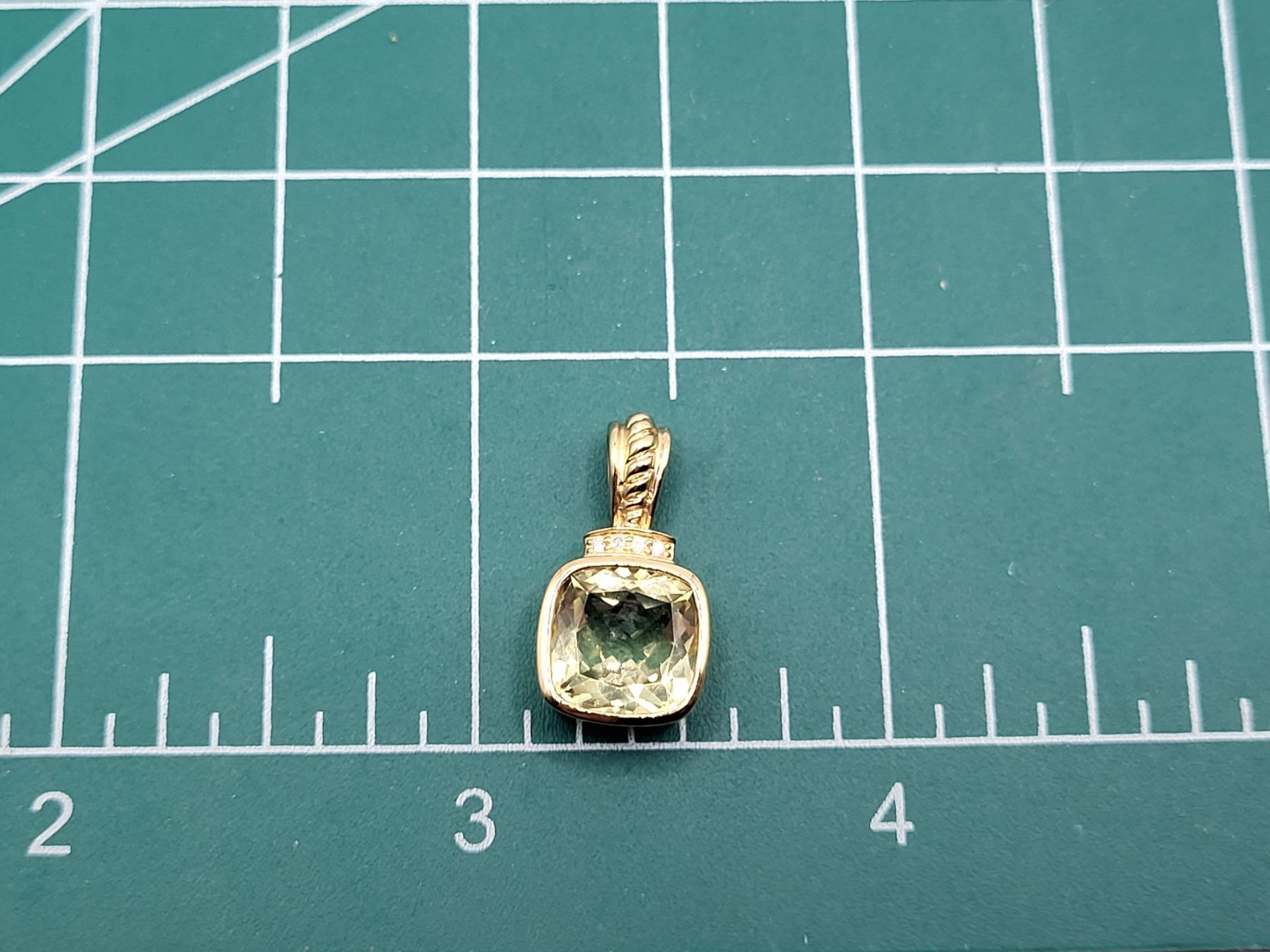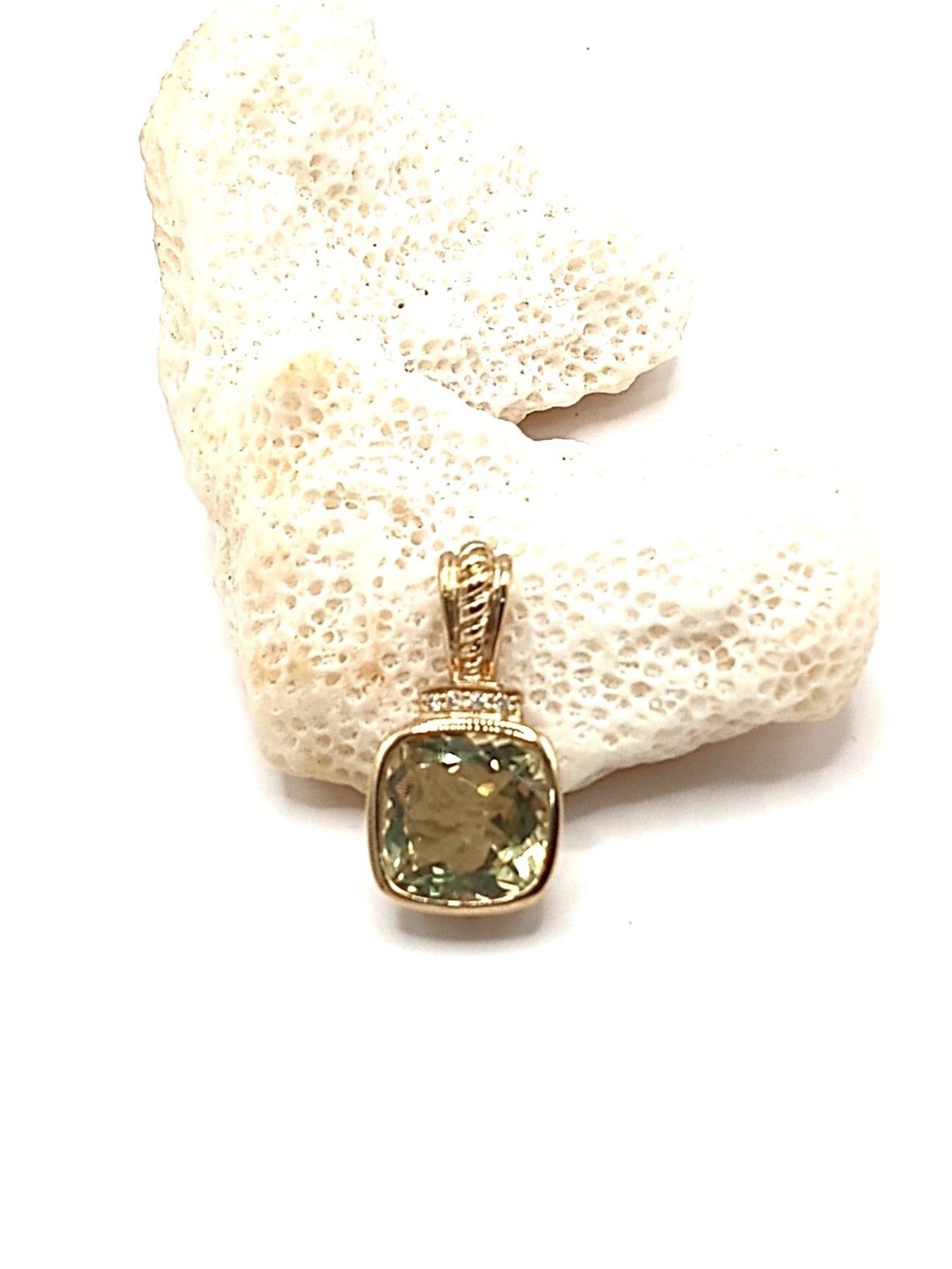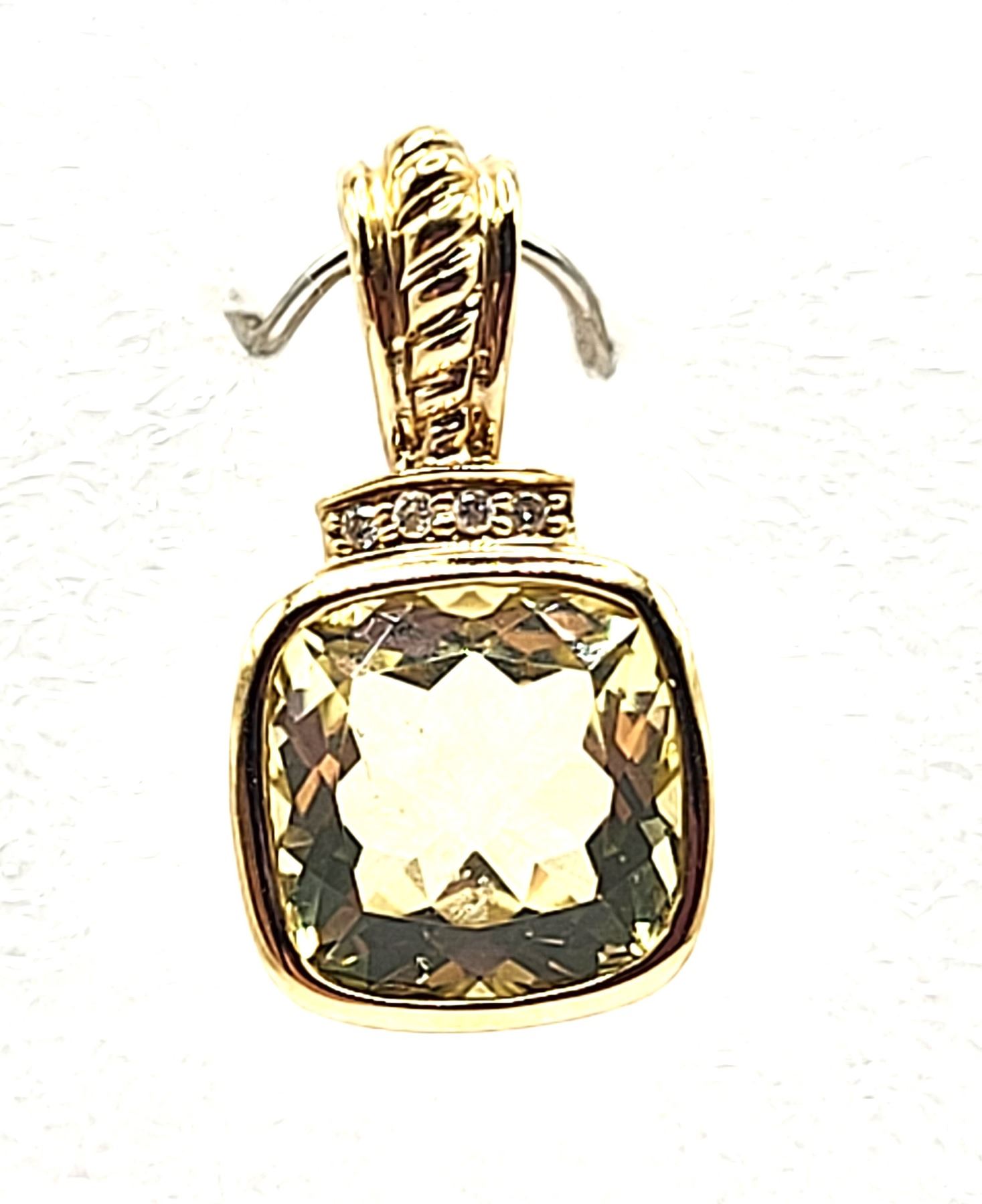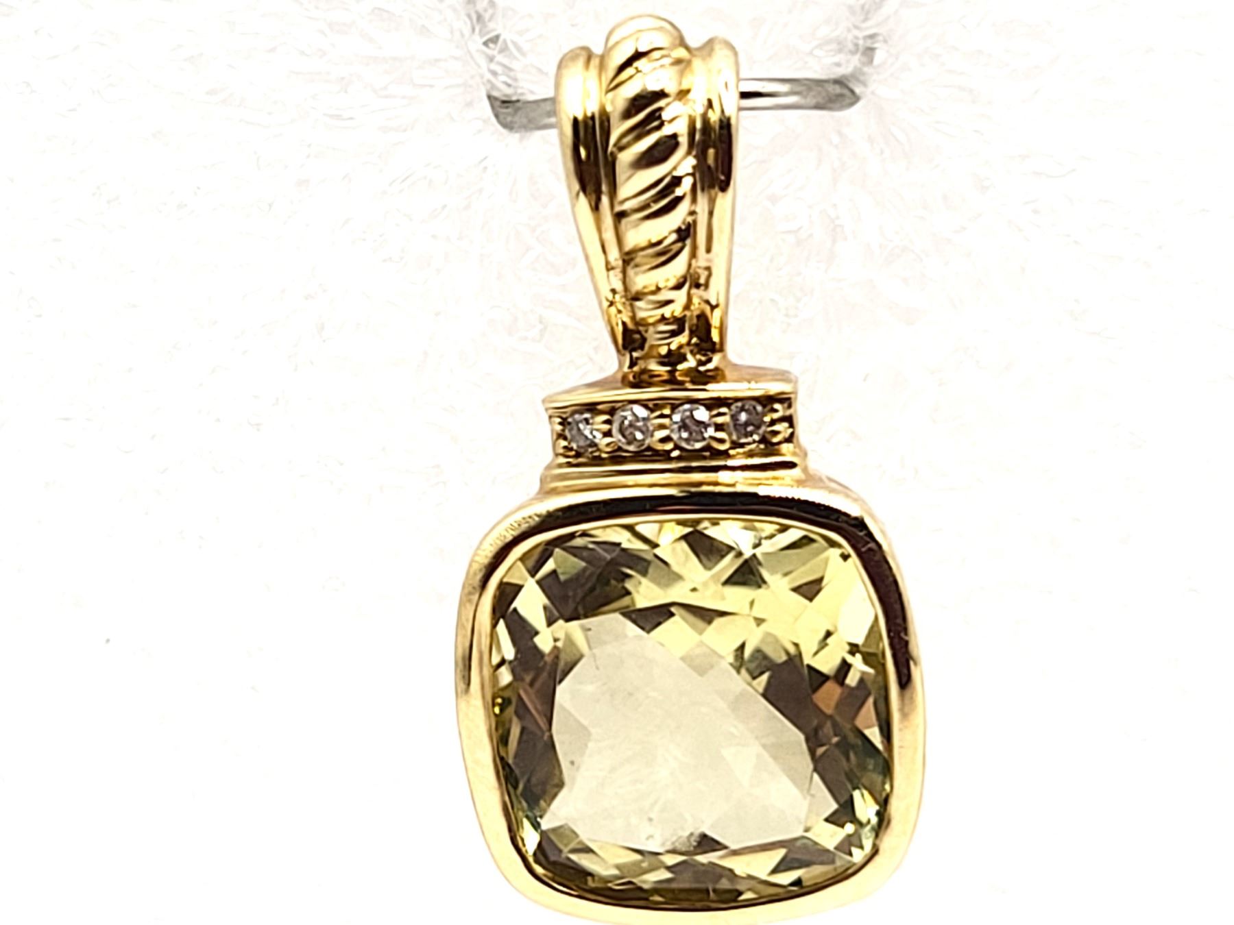 This is a pair of 14 karat yellow gold earrings that feature 6.75 carats total weight of cushion-cut, bezel-set, genuine lemon quartz and .04 carats total weight round, brilliant-cut, H color, SI2 clarity accent diamonds. These earrings have twisted rope designs at the bottoms, that curve back as part of the Omega back closure.