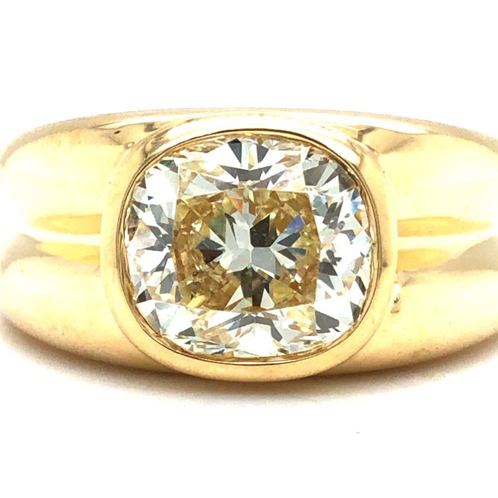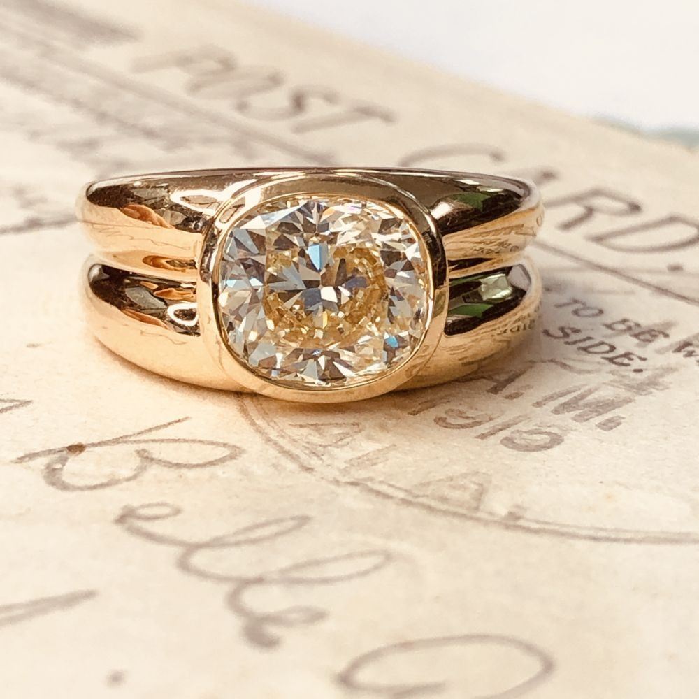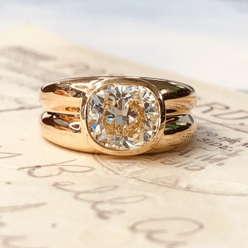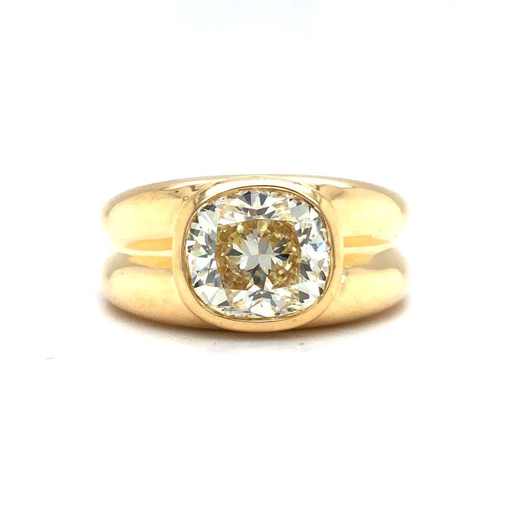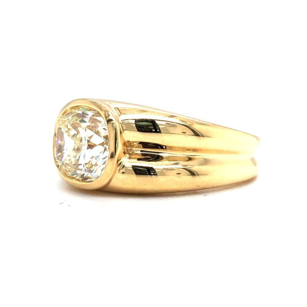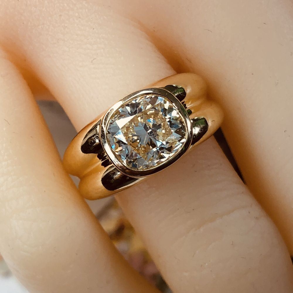 ADDITIONAL INFORMATION: A polished yellow gold ring with ribbed shoulders and shank feature a spectacular bezel-set, cushion-cut diamond.& nbsp; This diamond is breathtaking, with it's high crown displaying the reflecting facets, and the wide table allowing a view into its dazzling interior.& nbsp; This diamond is not lacking in fire or scintillation!& nbsp; The ring has an ornate gallery& nbsp; and bears the Oscar Friedman hallmark.