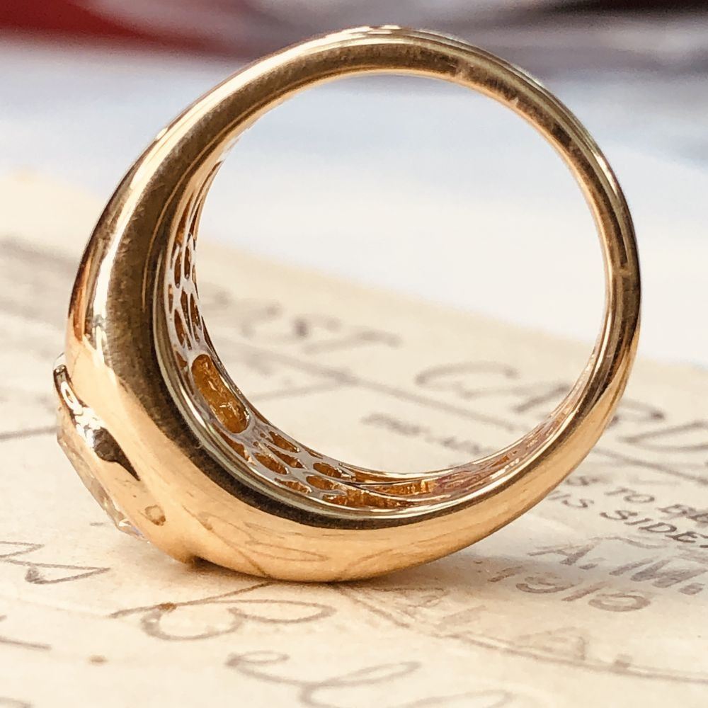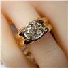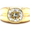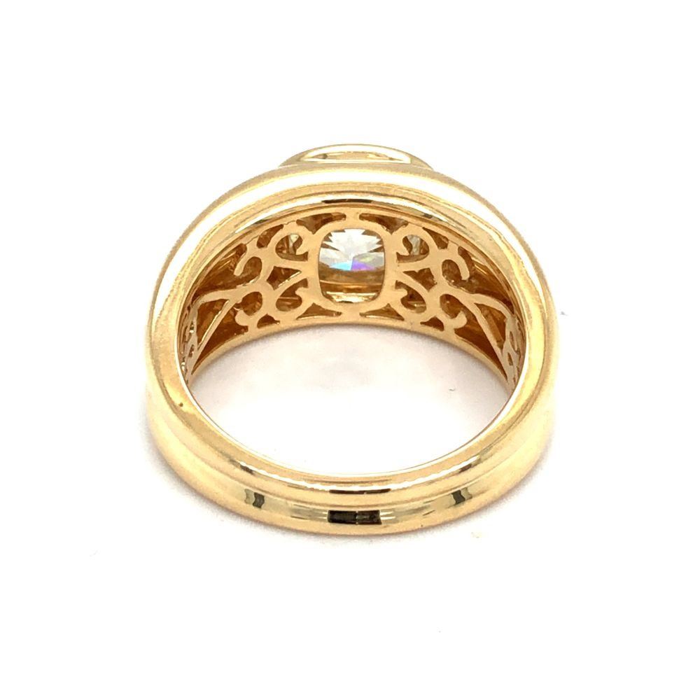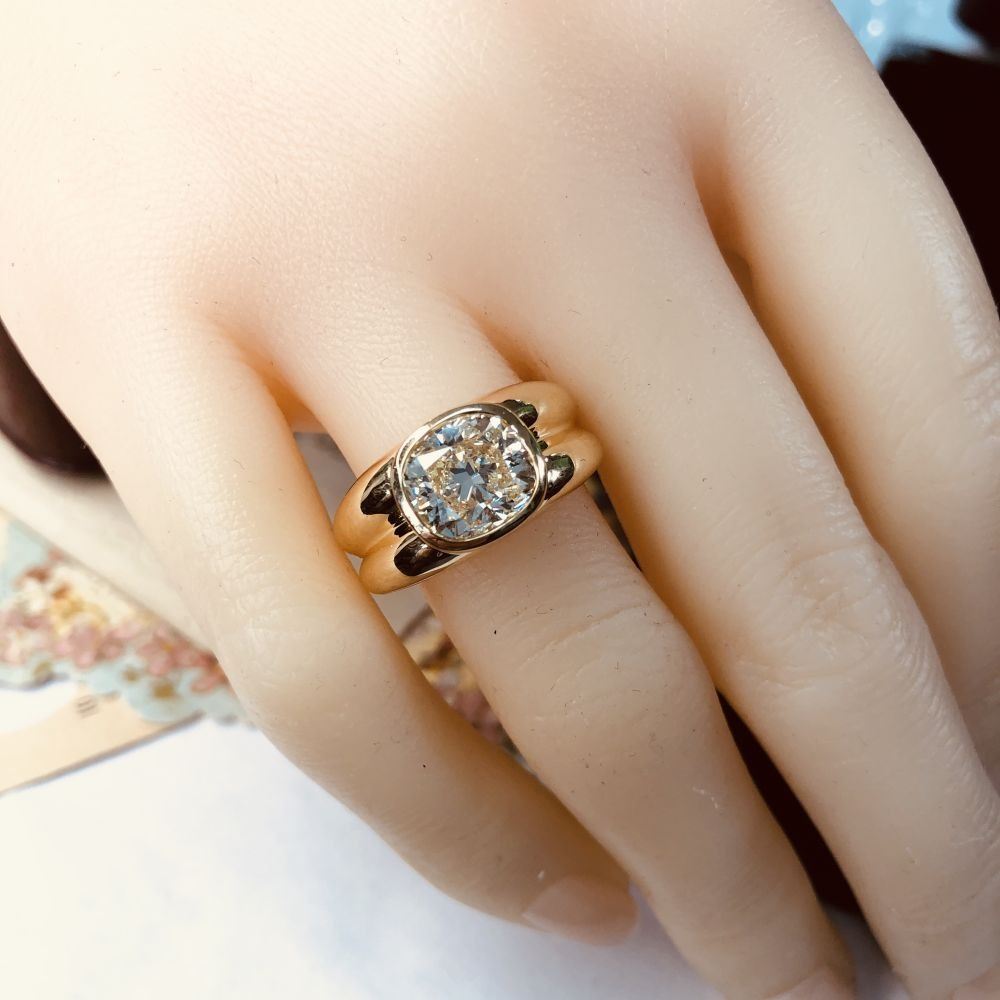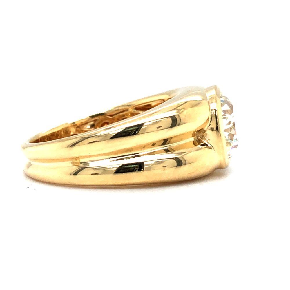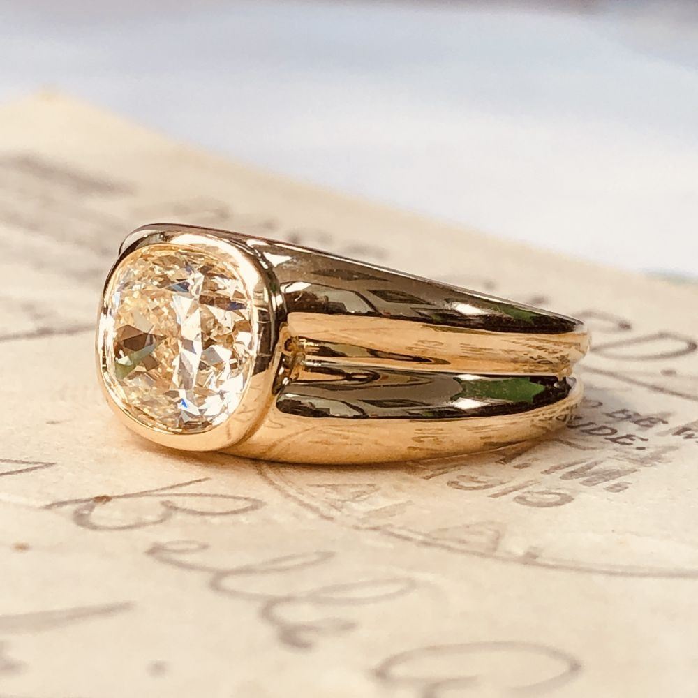ADDITIONAL INFORMATION: A polished yellow gold ring with ribbed shoulders and shank feature a spectacular bezel-set, cushion-cut diamond.& nbsp; This diamond is breathtaking, with it's high crown displaying the reflecting facets, and the wide table allowing a view into its dazzling interior.& nbsp; This diamond is not lacking in fire or scintillation!& nbsp; The ring has an ornate gallery& nbsp; and bears the Oscar Friedman hallmark.