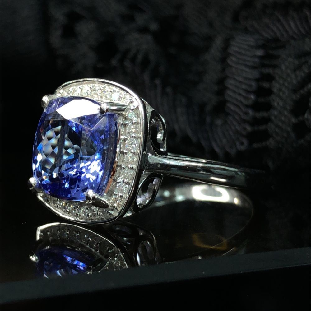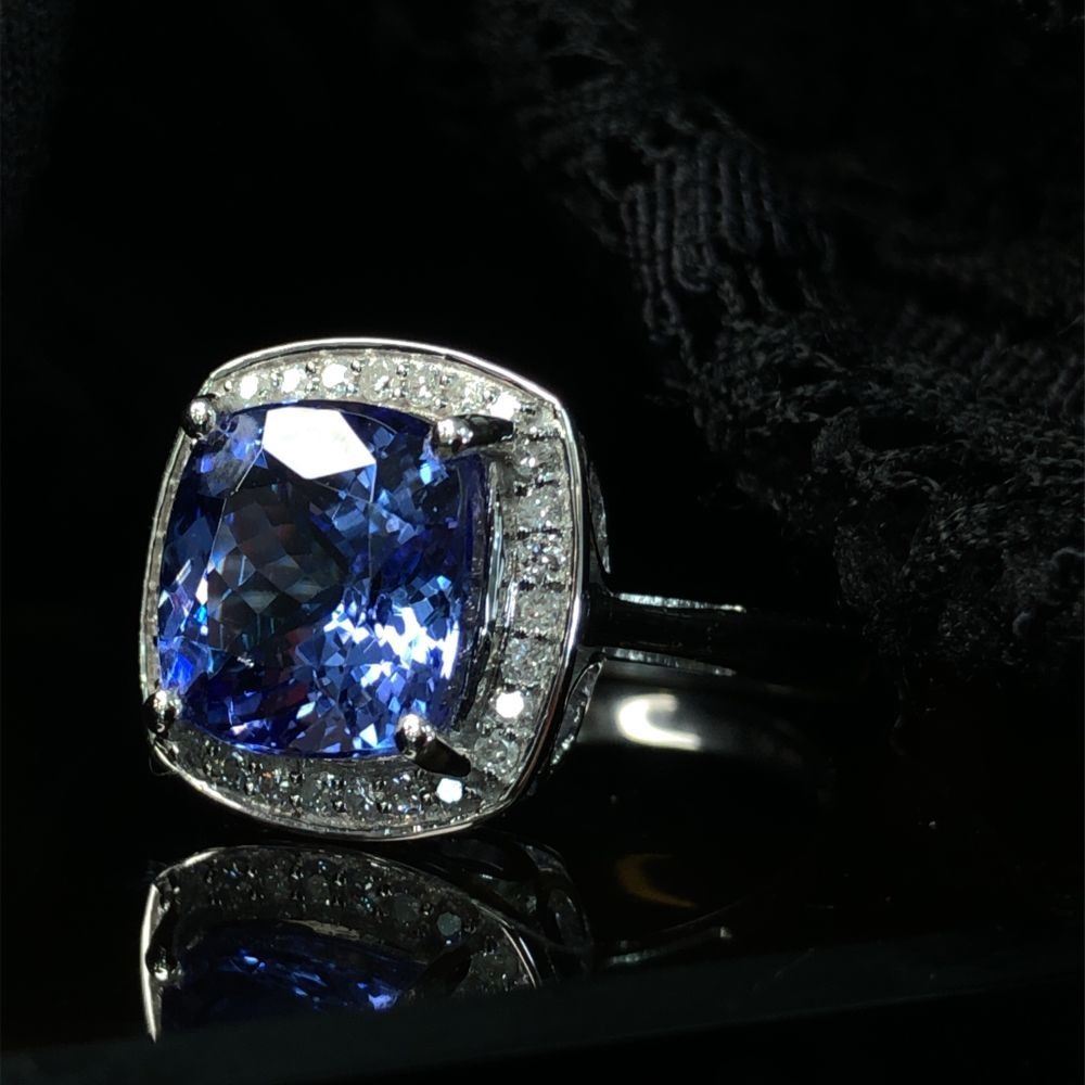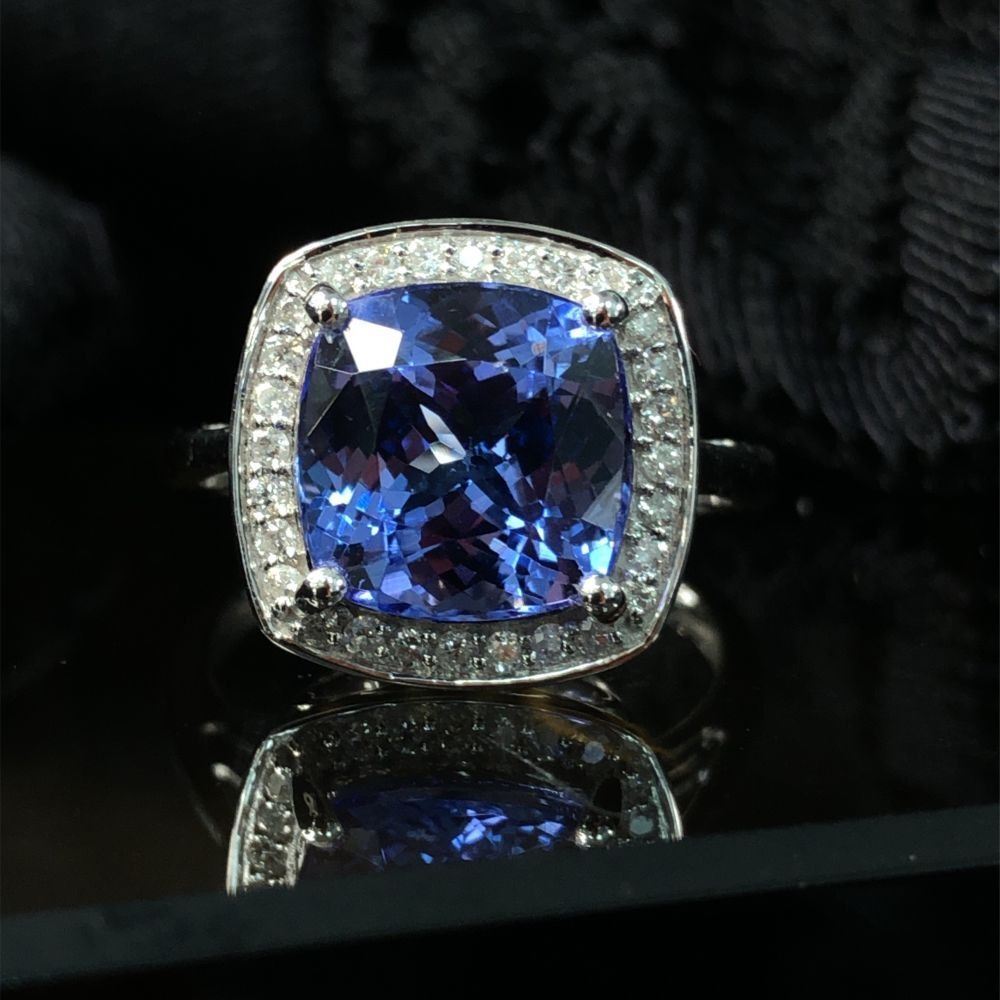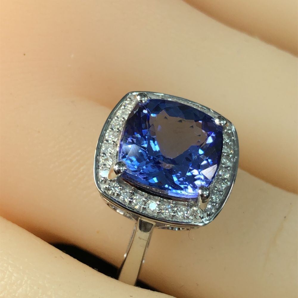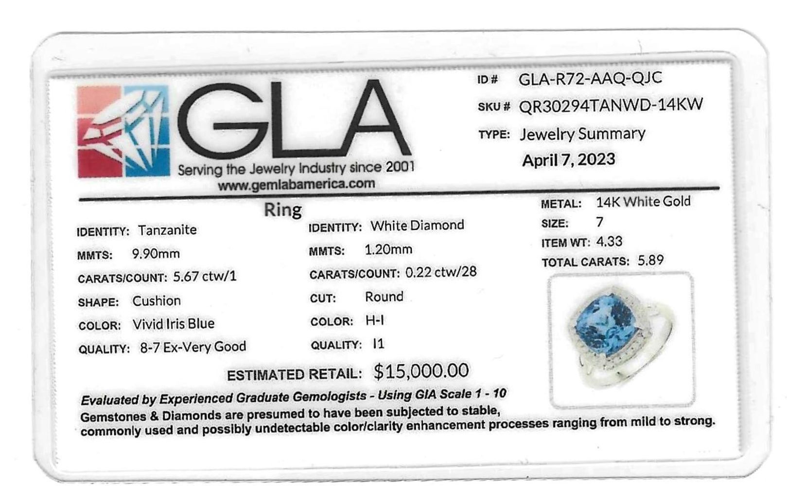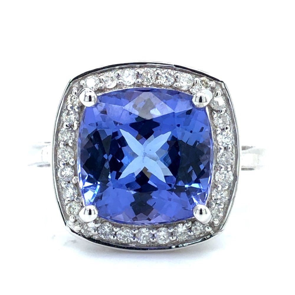 Genuine Tanzanite and Earth-Mined Diamond Ring. A beautiful iris-colored 5.67 carat cushion-cut tanzanite earns the spotlight in this 14 karat white gold ring with .22 carats of round, brilliant-cut, H-I color, I1 clarity diamonds in the graceful frame. The faceted pavilion of this gemstone adds even more sparkle and pizzazz. The ring is US size 7 with an ornate swirled open gallery. This ring can be resized for an additional $100, please allow an additional 10 days for shipping if we resize it. This ring is certified and appraised for $15,000.00 estimated retail replacement value.& nbsp;
