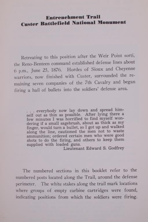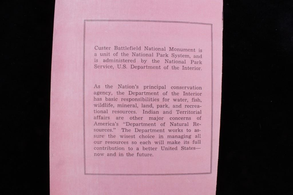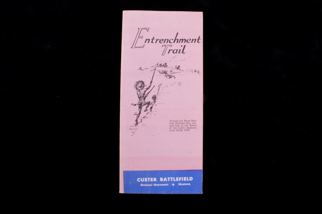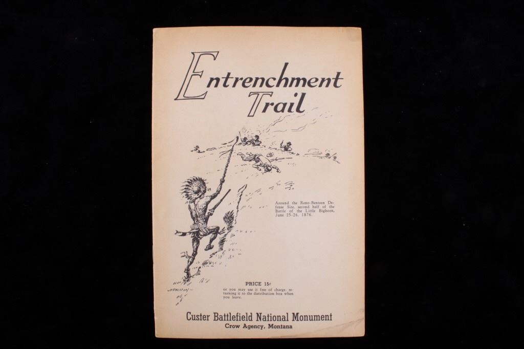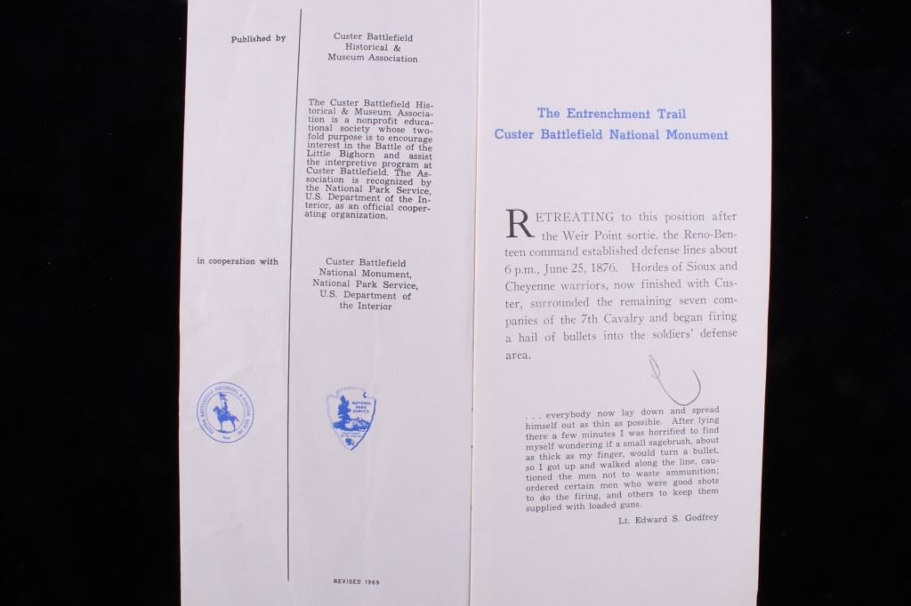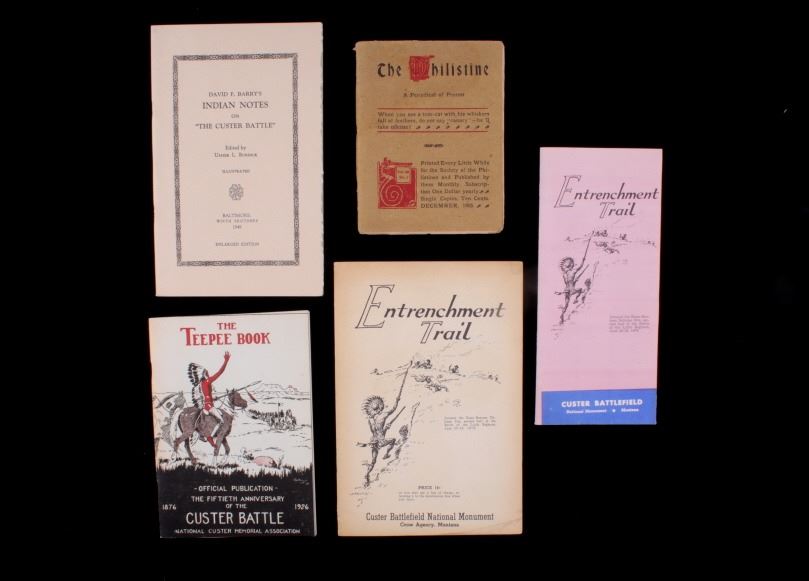 Offered in this lot is a collection of five booklets about Custer Battlefield (battle at the Little Big Horn), published from 1905 to 1969. The first booklet is "The Teepee Book", the official publication of the fiftieth anniversary of the Custer Battle 1876-1926. This is a collection of letters and stories about the battle and the people involved. The next booklet is David Barry's Indian notes on "The Custer Battle" 1949. An excerpt from the booklet and statement by Usher Burdick says, "There are some matters which will be of great interest to students of western history, and for that reason I am presenting these notes with the hope that it will add something to what we already know about an affair where there were no white survivors.” The third and fourth booklets are "Entrenchment Trail"; these guide books speak to places on the battlefield of note and were published by Custer Battlefield National Monument Crow Agency, Montana. The last booklet is a December 1905 copy of “The Philistine” that has a story about the author’s journey through the battlefield. It is interesting to note that the name was not changed from "Custer's Battle Field" to “Little Bighorn Battlefield National Monument" until 1991, showing the many years it took to acknowledge the Native Americans side of history. These booklets range in size from 9" X 6" to 6" X 41/2" and are in very good condition for their age.