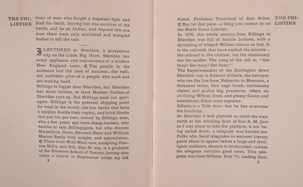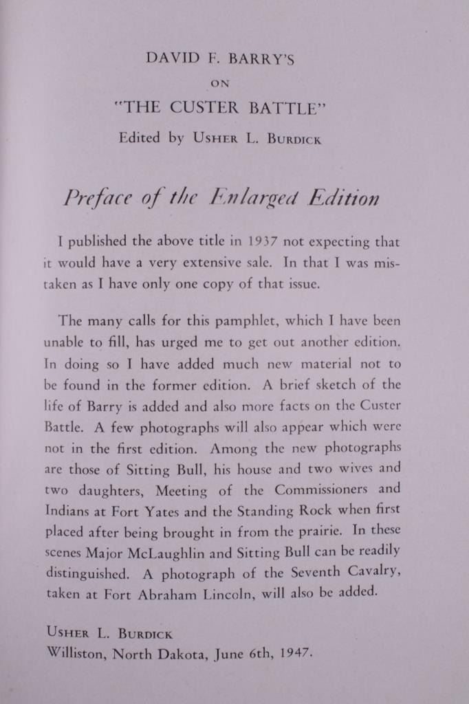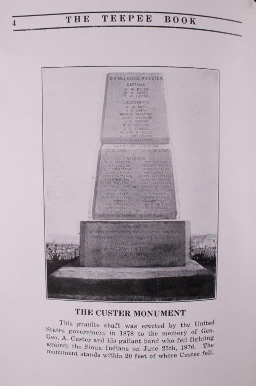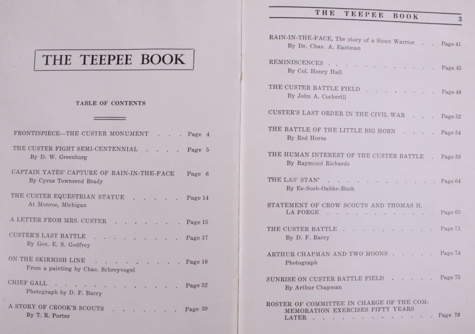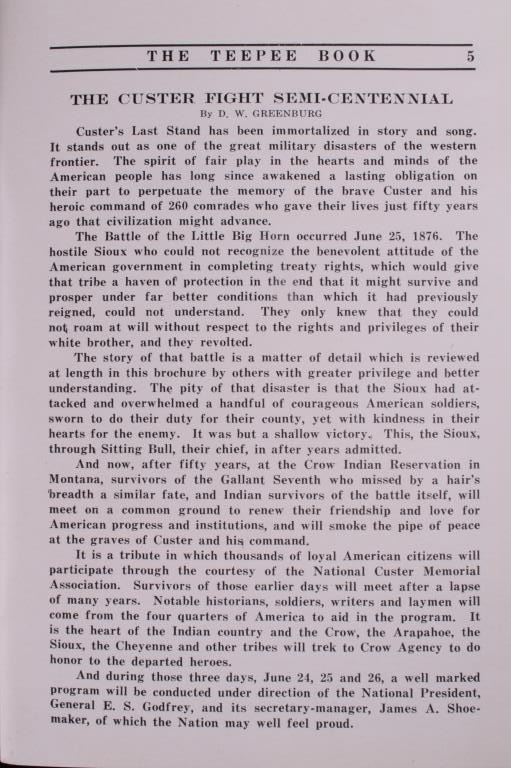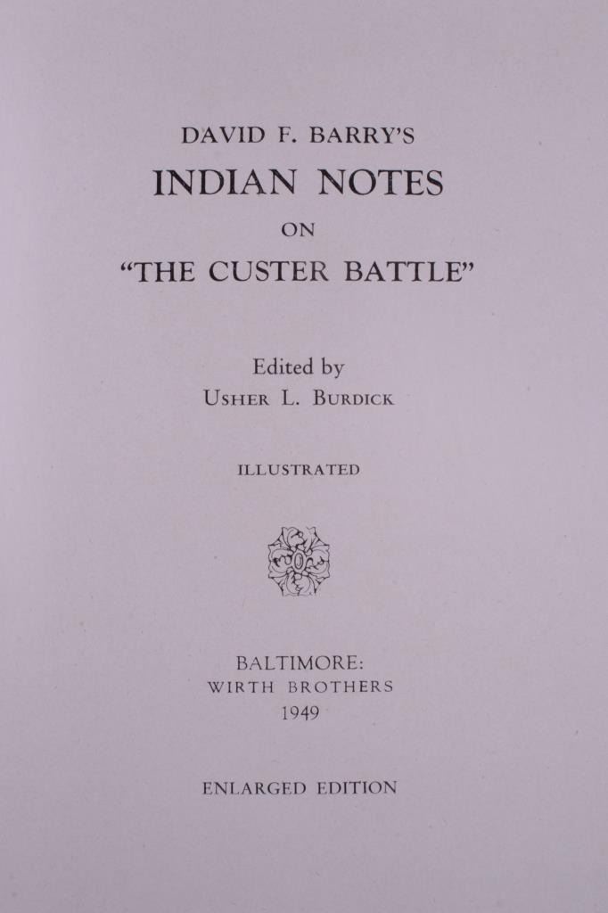 Offered in this lot is a collection of five booklets about Custer Battlefield (battle at the Little Big Horn), published from 1905 to 1969. The first booklet is "The Teepee Book", the official publication of the fiftieth anniversary of the Custer Battle 1876-1926. This is a collection of letters and stories about the battle and the people involved. The next booklet is David Barry's Indian notes on "The Custer Battle" 1949. An excerpt from the booklet and statement by Usher Burdick says, "There are some matters which will be of great interest to students of western history, and for that reason I am presenting these notes with the hope that it will add something to what we already know about an affair where there were no white survivors.” The third and fourth booklets are "Entrenchment Trail"; these guide books speak to places on the battlefield of note and were published by Custer Battlefield National Monument Crow Agency, Montana. The last booklet is a December 1905 copy of “The Philistine” that has a story about the author’s journey through the battlefield. It is interesting to note that the name was not changed from "Custer's Battle Field" to “Little Bighorn Battlefield National Monument" until 1991, showing the many years it took to acknowledge the Native Americans side of history. These booklets range in size from 9" X 6" to 6" X 41/2" and are in very good condition for their age.