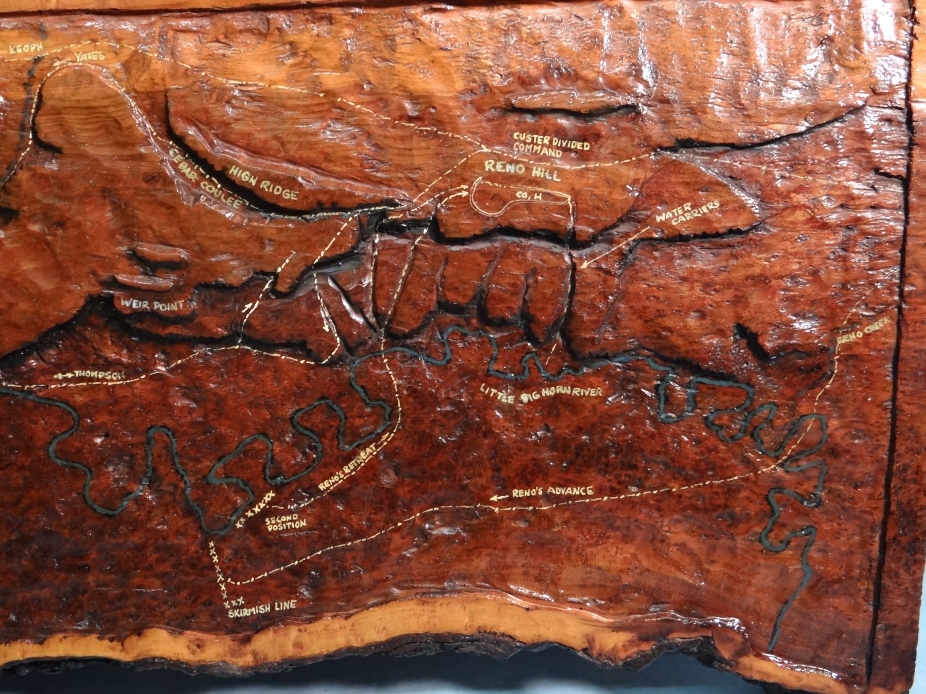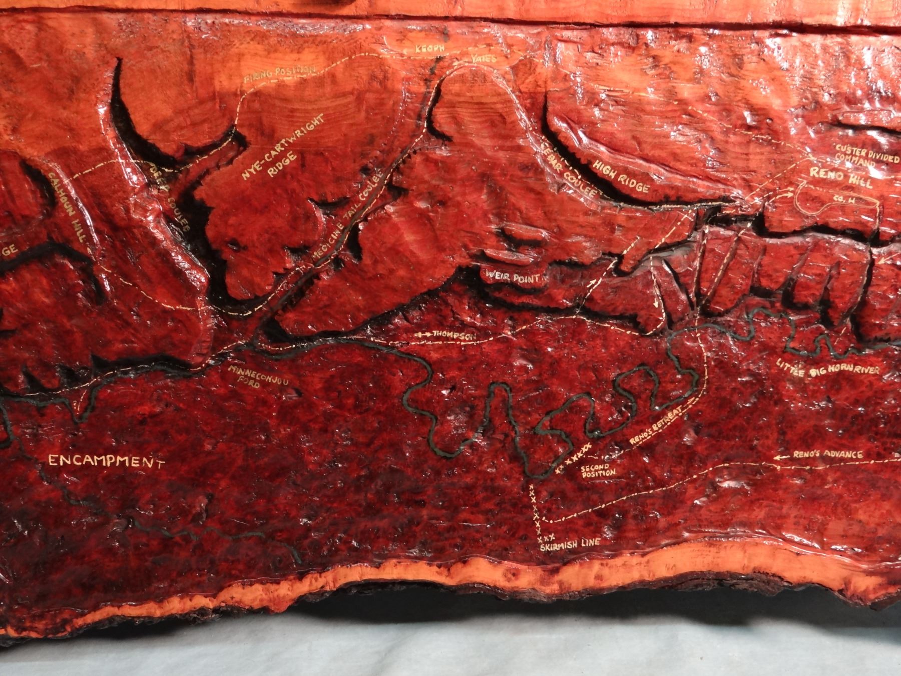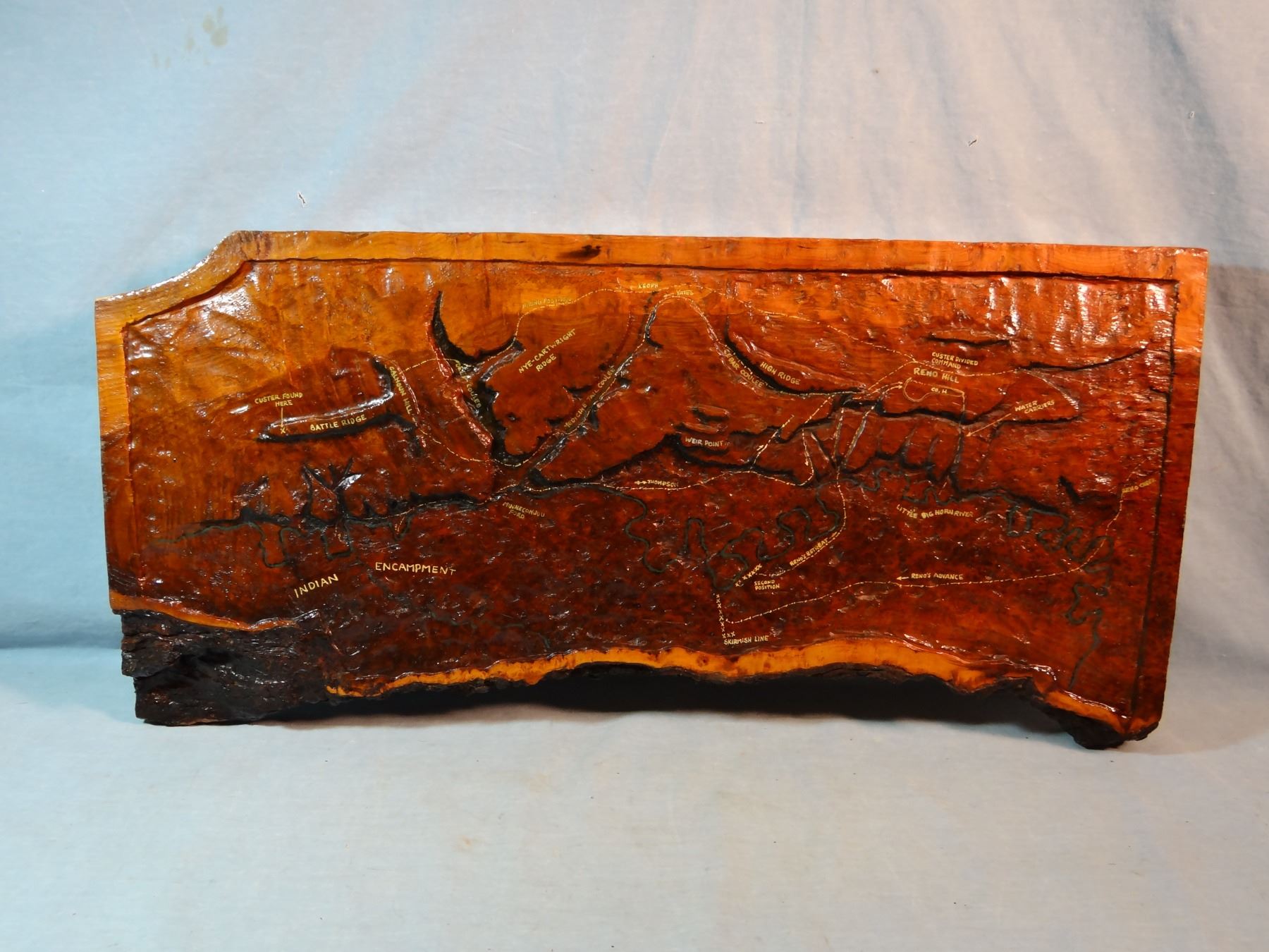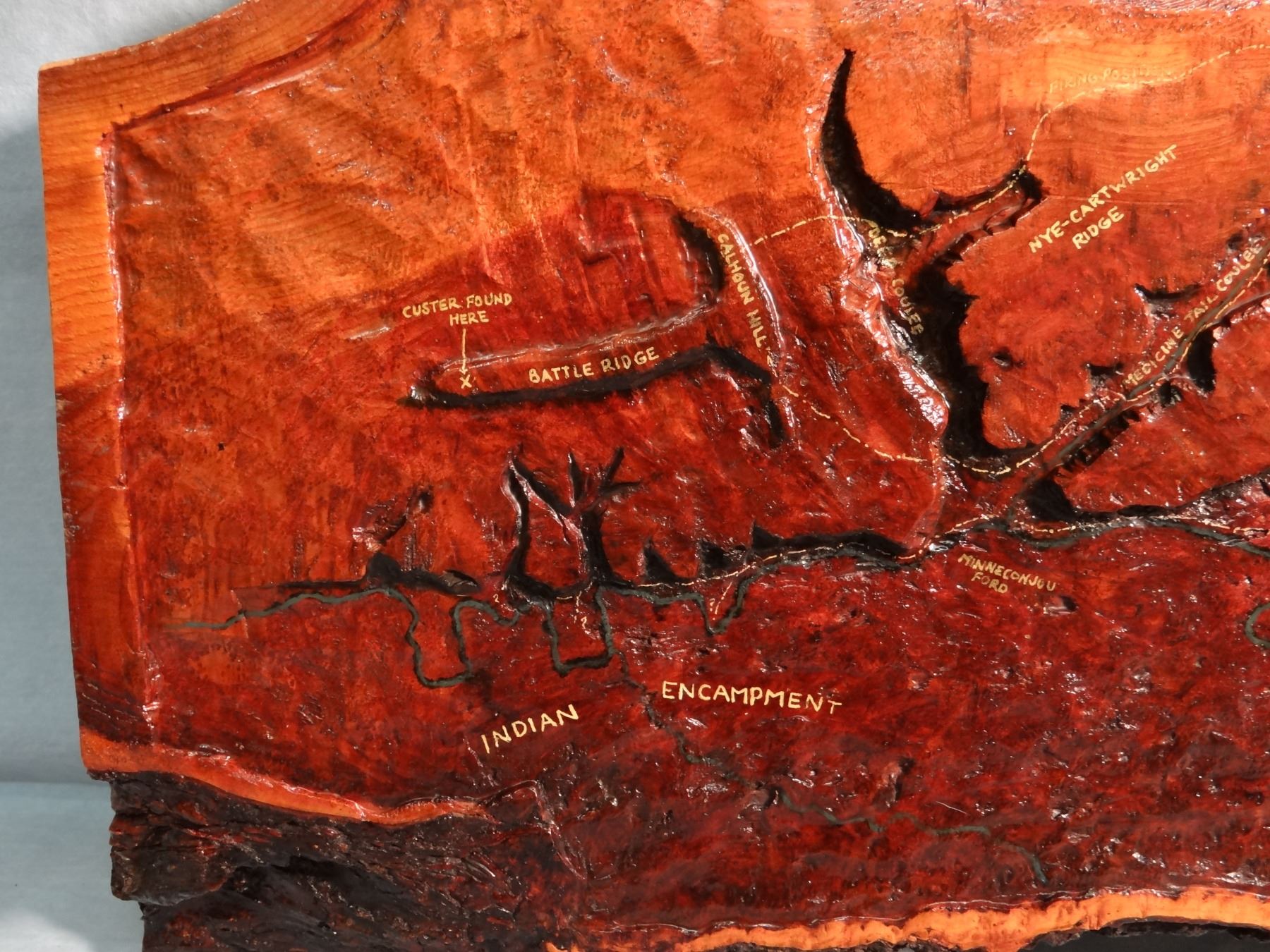Custer Battlefield relief carving on pine, 12" x 28", exceptional detail