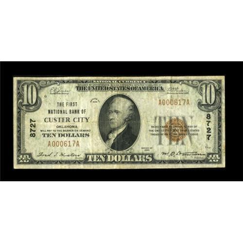 <B>Custer City, OK</B></I> - $10 1929 Ty. 1 <B>The First NB</B></I> Ch. # 8727<BR> A decent small example from this always popular Custer County location. <B>Fine+.</B></I><BR><BR><b>Shipping:</b> Coins & Currency (<a target="_blank" href="http://www.heritageauctions.com/common/shipping.php">view shipping information</a>)