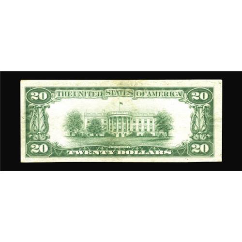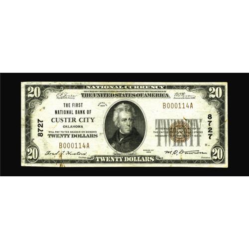 <B>Custer City, OK</B></I> - $20 1929 Ty. 1 <B>The First NB</B></I> Ch. # 8727<BR>Only five of the surviving 15 1929 examples are of this type and denomination. This was the only bank to issue the 1929 series from here. Tonight's example is an otherwise <B>Extremely Fine</B></I> with a scattering of not especially distracting rust indications on the face.