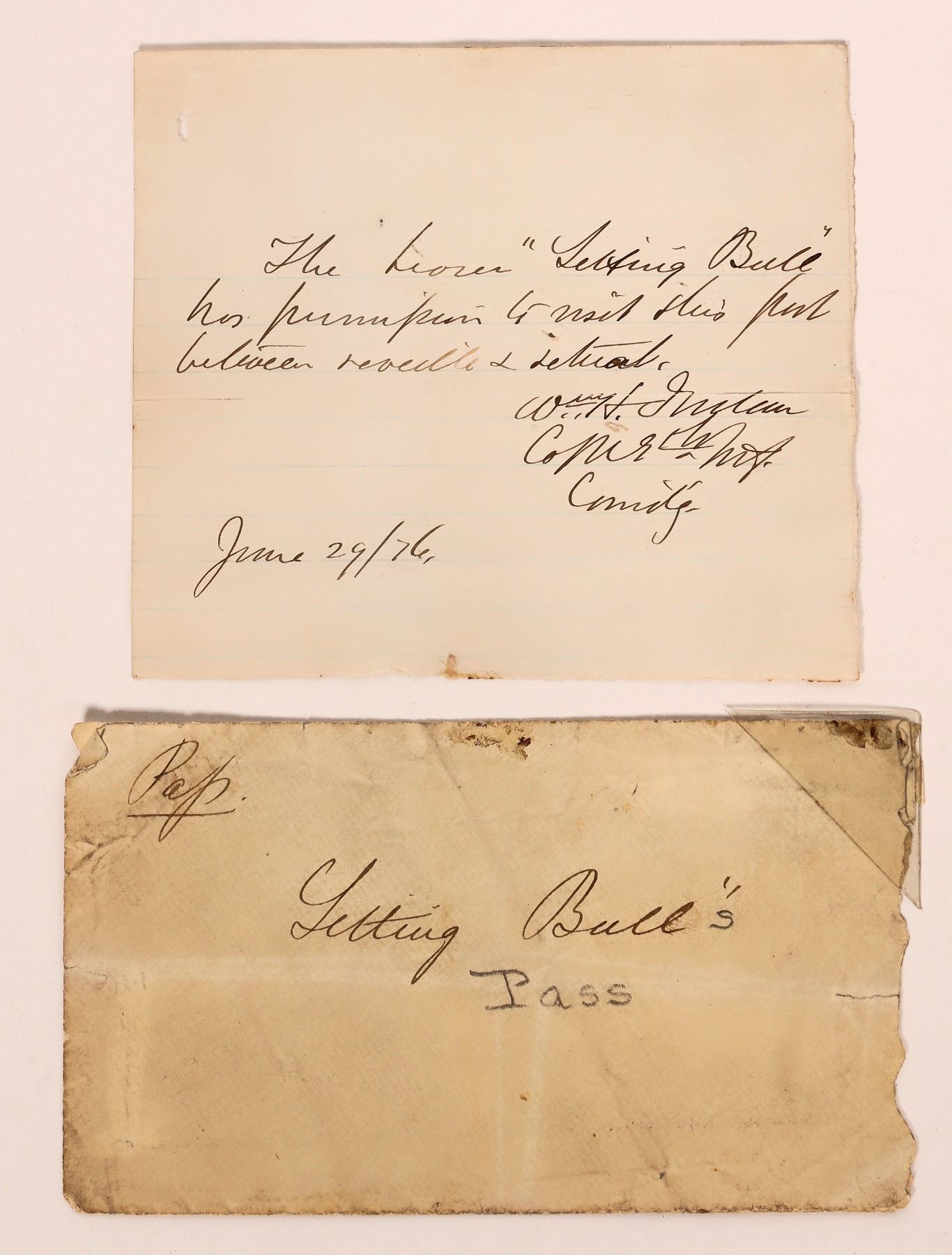 This letter contains the pass written by Wm. H. Inglun of the 9th Infantry to Chief Sitting Bull. The pass was written inviting Sitting Bull to talk peace four days after the Battle of the Little Big Horn. Chief Sitting Bull did not exercise this invitation to the fort. He chose, instead, to flee to Canada. The note is dated "June 29, 76". The envelope is written t "Sitting Bull/ PASS". Please see photos for details.