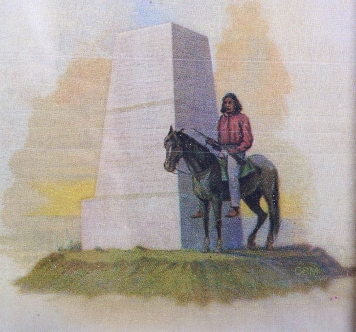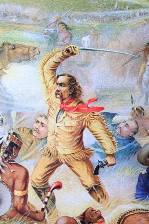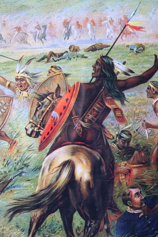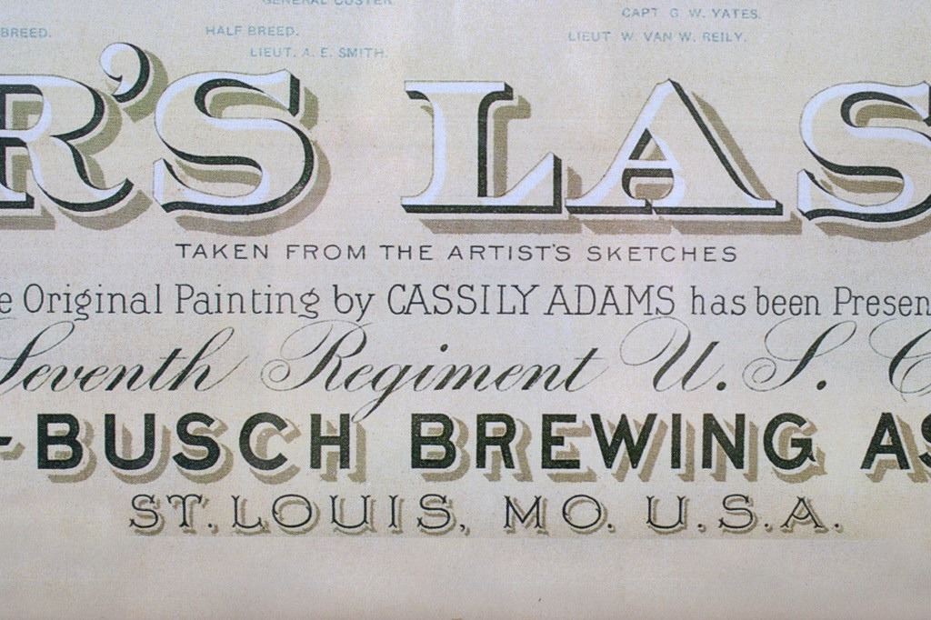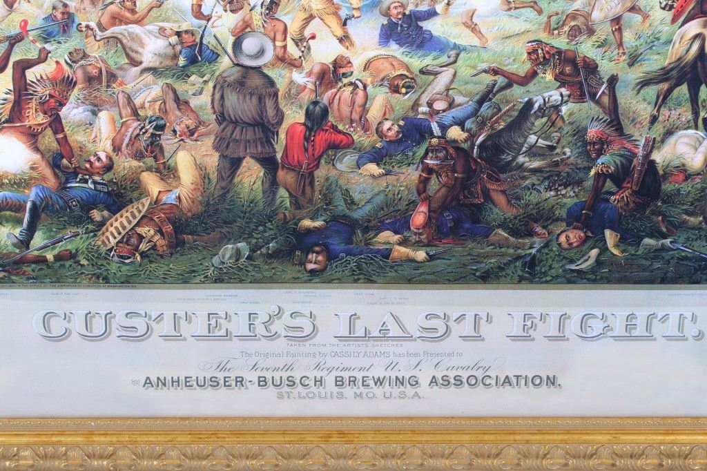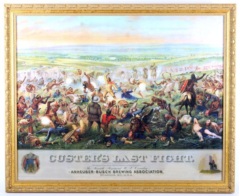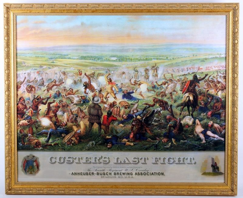 For your consideration is this well known poster of Custer's Last Fight--Anheuser Busch Brewing Association. The original, painted by Cassilly Adams in 1885, was acquired by Anheuser Busch Brewing Association in 1896 as the result of a St. Louis Saloon's bankruptcy proceedings. At the time the painting was valued at $10,000. It is said that the artist used Native Sioux in battle dress and cavalrymen in period uniforms as models; it took him one year to complete, measuring 9.5 feet x 16.5 feet. Anheuser Busch produced a lithographic print of the painting and began distributing prints to their distributors, bars, and other outlets. The original was donated by the brewery to the 7th Cavalry, as stated on the advertising print. It was destroyed by a fire in Fort Bliss, Texas in 1946. The print being auctioned today is in a beautiful gilded wood frame and is in excellent condition. It measures 43.5" x 36".