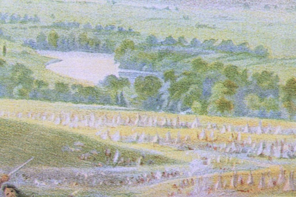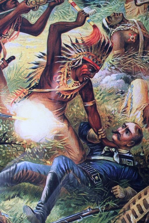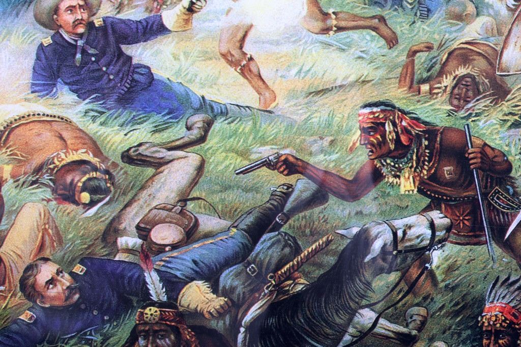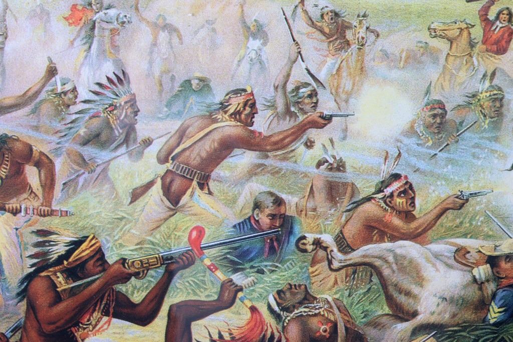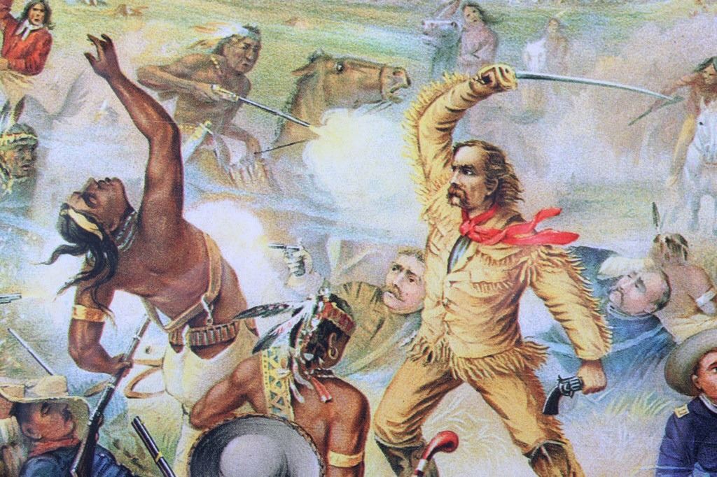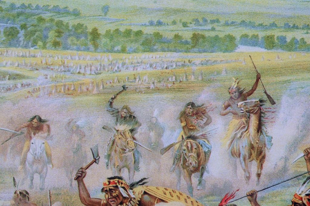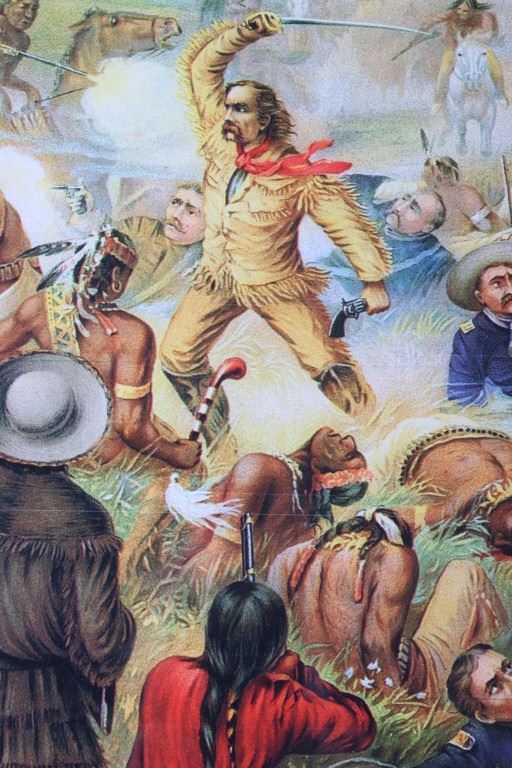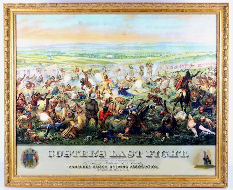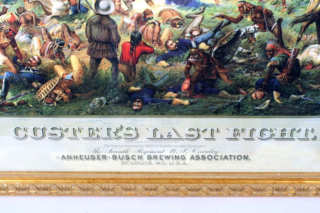 For your consideration is this well known poster of Custer's Last Fight--Anheuser Busch Brewing Association. The original, painted by Cassilly Adams in 1885, was acquired by Anheuser Busch Brewing Association in 1896 as the result of a St. Louis Saloon's bankruptcy proceedings. At the time the painting was valued at $10,000. It is said that the artist used Native Sioux in battle dress and cavalrymen in period uniforms as models; it took him one year to complete, measuring 9.5 feet x 16.5 feet. Anheuser Busch produced a lithographic print of the painting and began distributing prints to their distributors, bars, and other outlets. The original was donated by the brewery to the 7th Cavalry, as stated on the advertising print. It was destroyed by a fire in Fort Bliss, Texas in 1946. The print being auctioned today is in a beautiful gilded wood frame and is in excellent condition. It measures 43.5" x 36".
